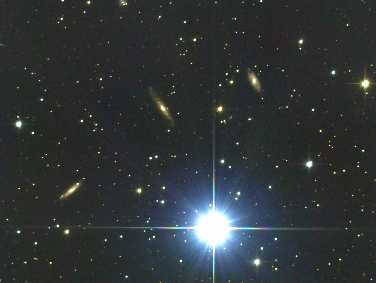 Dies ist ein einzigartiger und bemerkenswerter Fleck am Nachthimmel! 3 fast gleichhelle Galaxien (12 bis 13 mag, von gleichem Typ (Balkengalaxien SBb,SBa-b,SBb), nahezu gleiche Inklination, nahezu gleich groß, nur 11 bis 13 Bogenminuten vom hellen Ny Eridani entfernt, alle drei ca. 200 Millionen Lichtjahre von uns entfernt! Wo gibt es das sonst noch? Auch der Kontrast der gelben und deutlich strukturierten Galaxien zu dem hellen blauen(3.9mag, Spec B2,675 Lichtjahre entfernten) Ny Eridani ist wohl einmalig! Da diese Objekte, soweit mir bekannt, noch keine der so beliebten treffenden Namen bekommen haben, nenne ich sie einfach "Die Fliegenden Untertassen um Ny Eridani", im englischen Sprachgebrauch "The Flying Saucers", oder wer möchte "Die Drei UFOS". Die Idee dahinter: "Drei außerirdische Raumschiffe kreisen im Orbit um unseren strahlenden Heimatplaneten Erde".