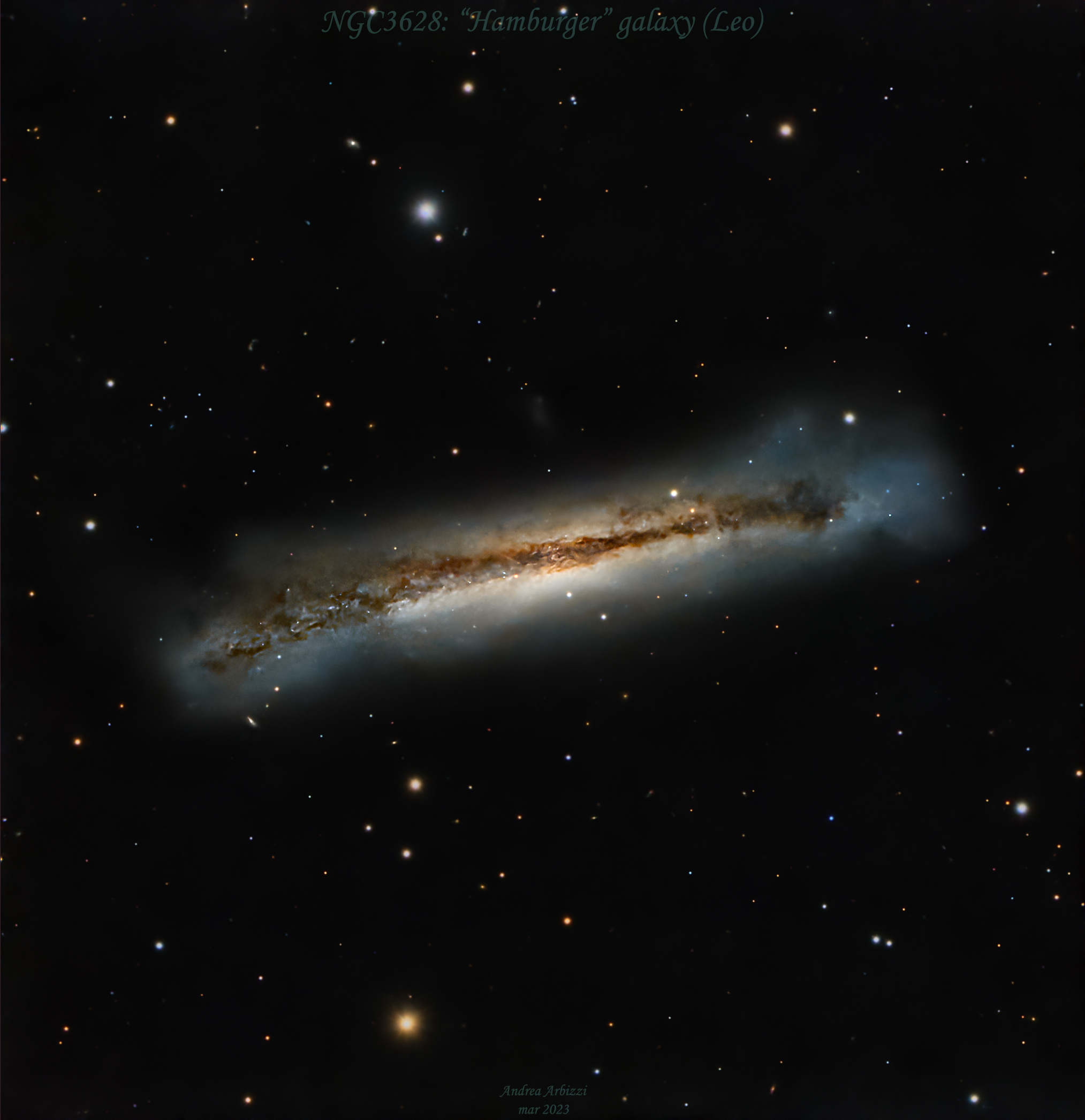 NGC 3628, also known as the »Hamburger galaxy« is an unbarred spiral galaxy about 35 million light-years away in the constellation Leo. Along with M65 and M66, it forms the well-known Leo Triplet, a group of three famous and brilliant galaxies.