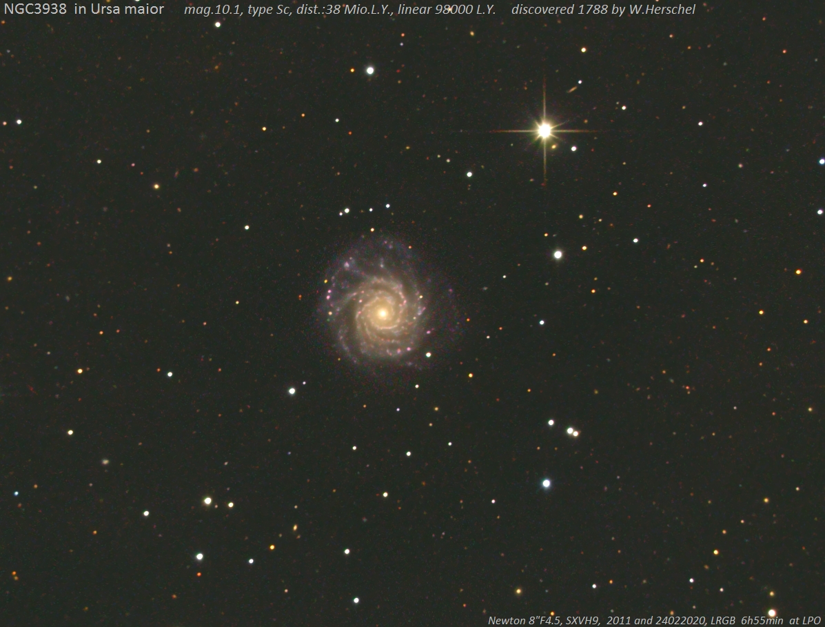 NGC 3938 ist eine schöne face-on "Grand design" Galaxie,die an M74 erinnert. Daten von 2011 und vom 24. Februar 2020 ergaben eine Gesamtbelichtungszeit von fast sieben Stunden.