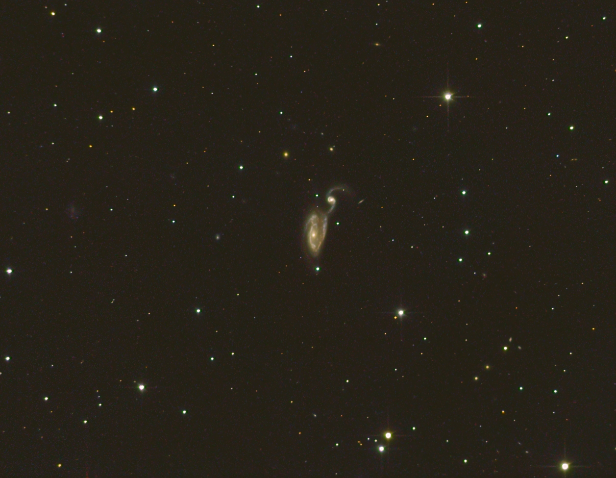 150 Millionen Lichtjahre entfernt liegt in den Jagdhunden dieses interessante und detailreiche Paar wechselwirkender Galaxien. Aufgrund der Form bekam es auch den Namen "The Heron" (Der Reiher).