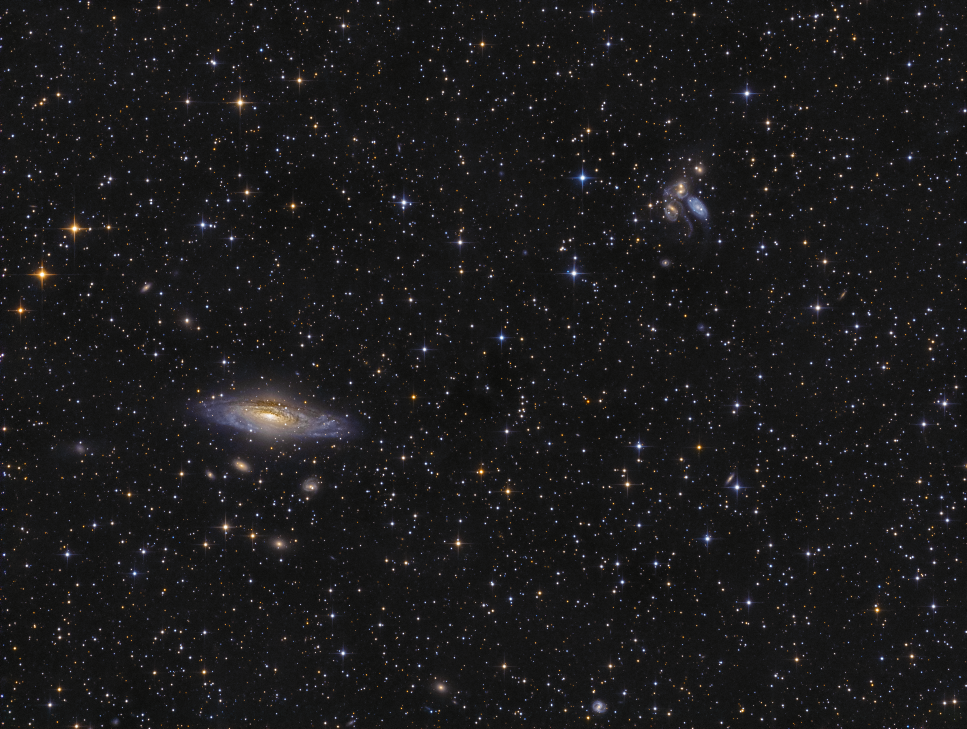 Diese prächtige Galaxie im Pegasus und die naheliegende interagierende Gruppe sind ein Klassiker, den ich hier besonders lang belichtete. Dabei wurde sichtbar, dass der ganze Hintergrund mit zarten Schwaden erfüllt ist, dem galaktischen Zirrus (integrated flux nebula, IFN). Ein kontrastverätktes Negativ zeigt diesen sehr viel deutlicher: