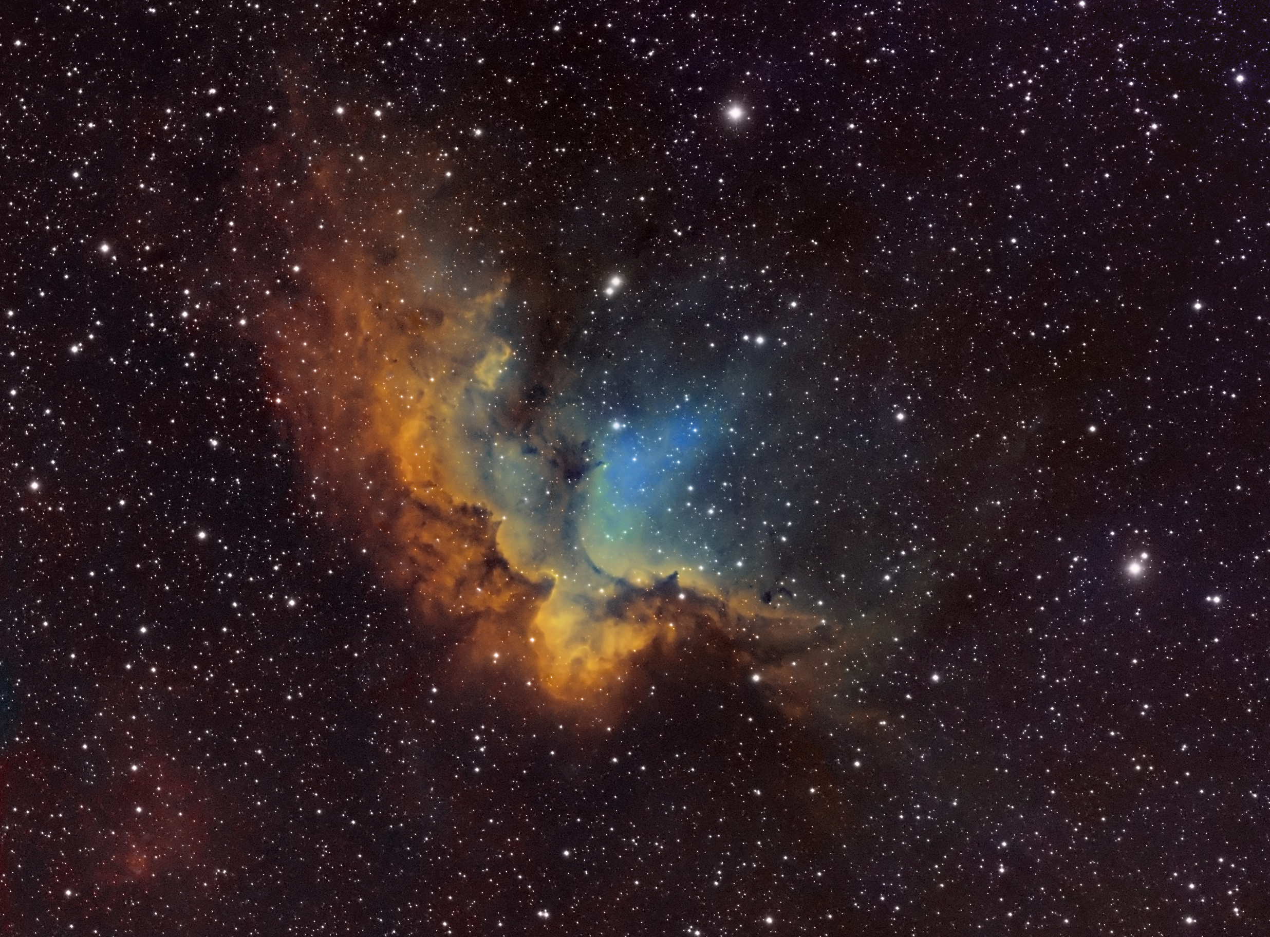 Da ich mitten aus dem Ruhrgebiet, aus der Stadt Essen (Nähe Innenstadt) fotografiere, habe ich bei meinen Aufnahmen ständig mit einer enormen Lichtverschmutzung zu kämpfen. Mir wurde daher geraten, mal Schmalbandfilter einzusetzen. Als Objekt hat mir der Wizard Nebula, NGC7380, schon immer besonders gefallen. Das Ergebnis hat mich nun überzeugt, denn derartige Nebel lassen sich mit Schmalbandfiltern auch ganz gut aus dem "Revier" aufnehmen.