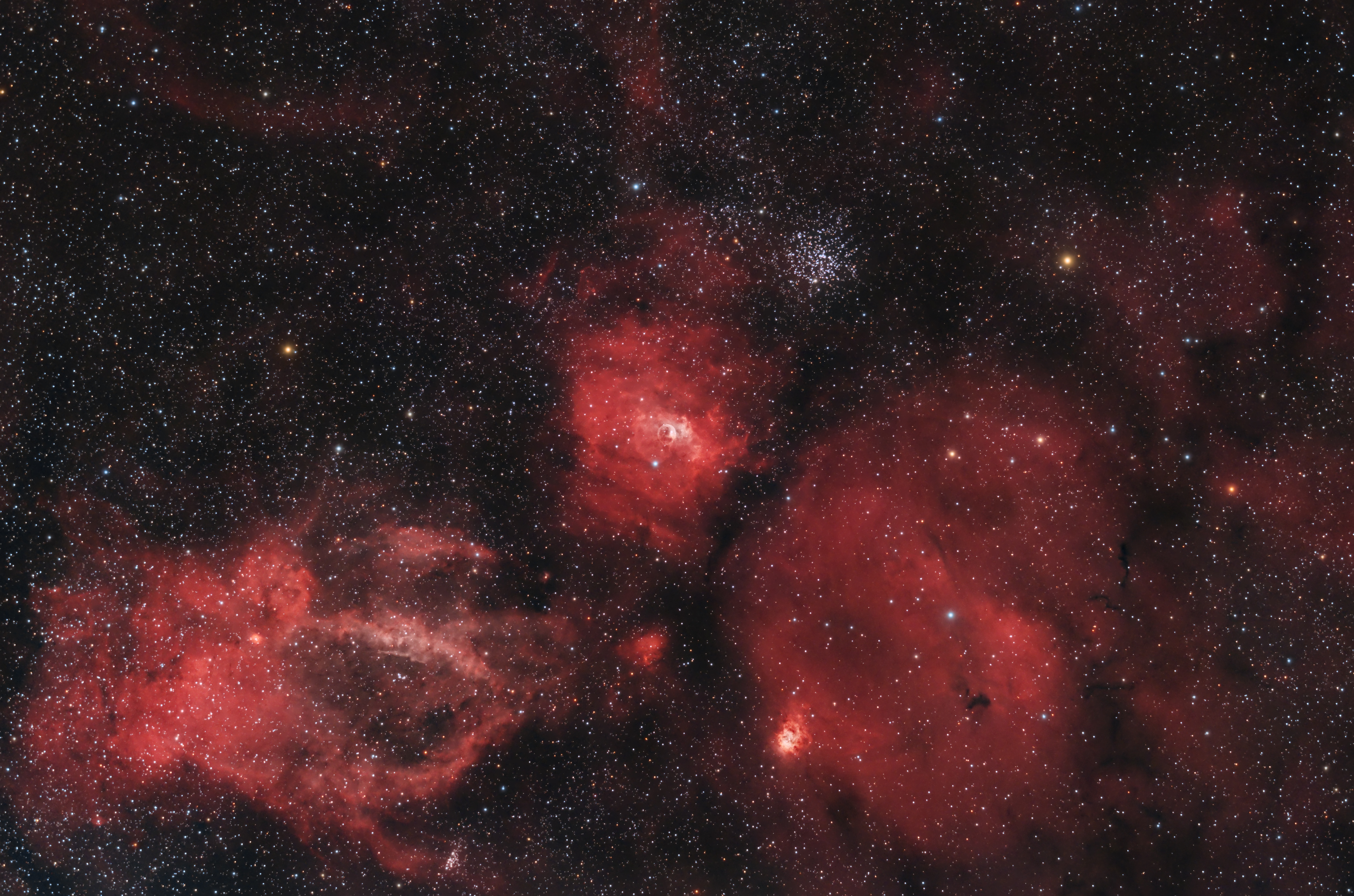 Der Blasennebel steht derzeit optimal am Himmel. Dieses Bild entstand Anfang 2020 und zeigt dank kurzer Brennweite von 352mm auch die Umgebung von NGC 7635. Dazu zählen zwei offene Sternhaufen Messier 52 und NGC 7510, aber auch Sharpless 157 oder NGC 7538. Um die HII-Regionen hervorzuheben, habe ich auch Bilder hinzugefügt, die durch ein Schmalbandfilter (lEnhance) belichtet wurden. Ungefilterte Bilder sind nötig, um die Sternfarben möglichst korrekt darzustellen.