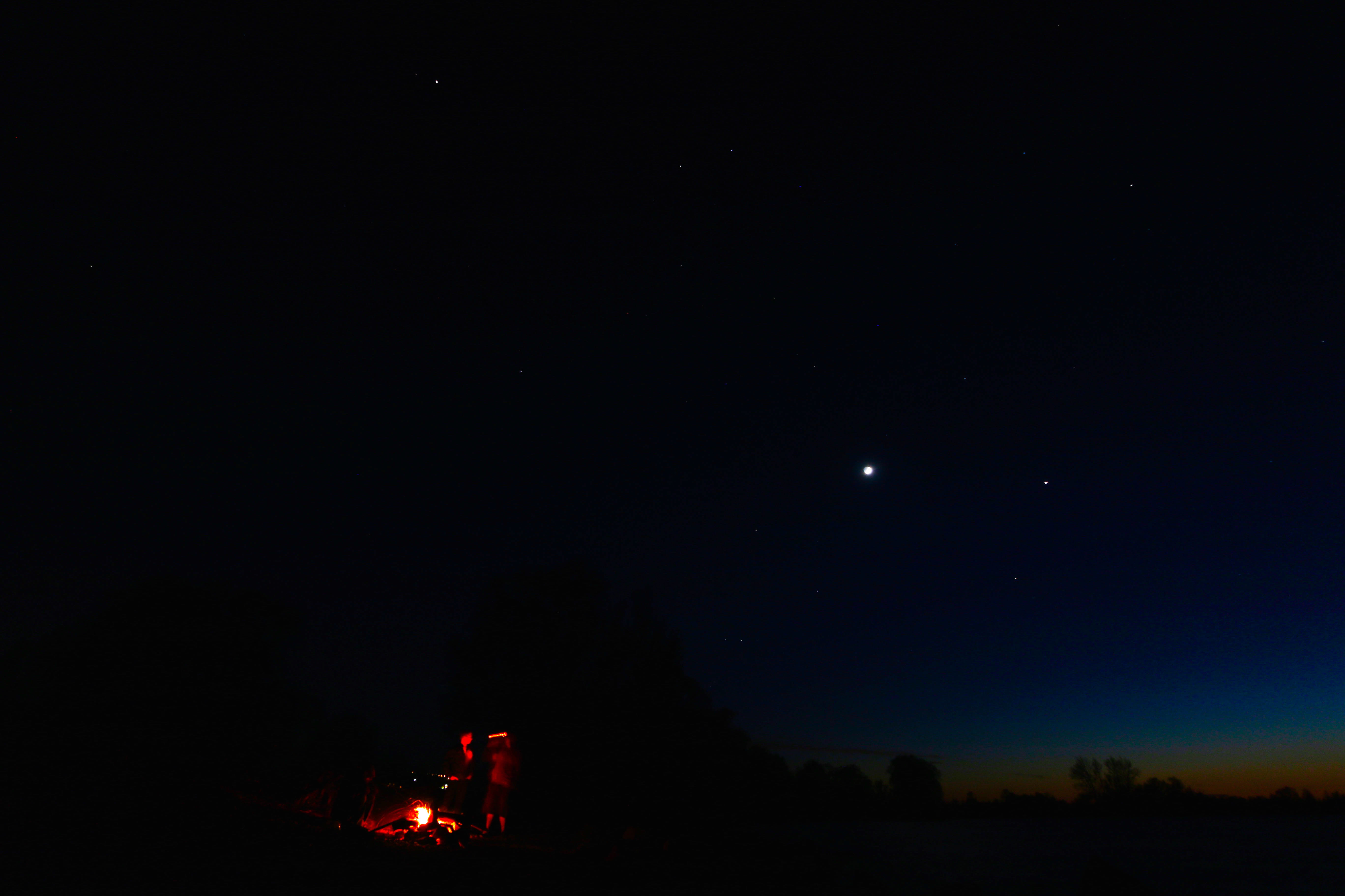 Diese schöne Aufnahme entstand am 22. April 2015 in Hard am Bodensee (Vorarlberg, Österreich) mit Blick Richtung Schweiz. Während am rechten Bildrand die letzten Sonnenstrahlen den Untersee farbenfroh erhellen, zieht über dem Ländle bereits die Nacht herein. Im linken oberen Drittel schiebt sich Jupiter ins Bild, während sich im rechten Bereich Orion, der Mond und Venus ein Stelldichein geben. Eine Gruppe junger Menschen genießt die beeindruckende Atmosphäre dieser lauen Frühlingsnacht am Lagerfeuer.