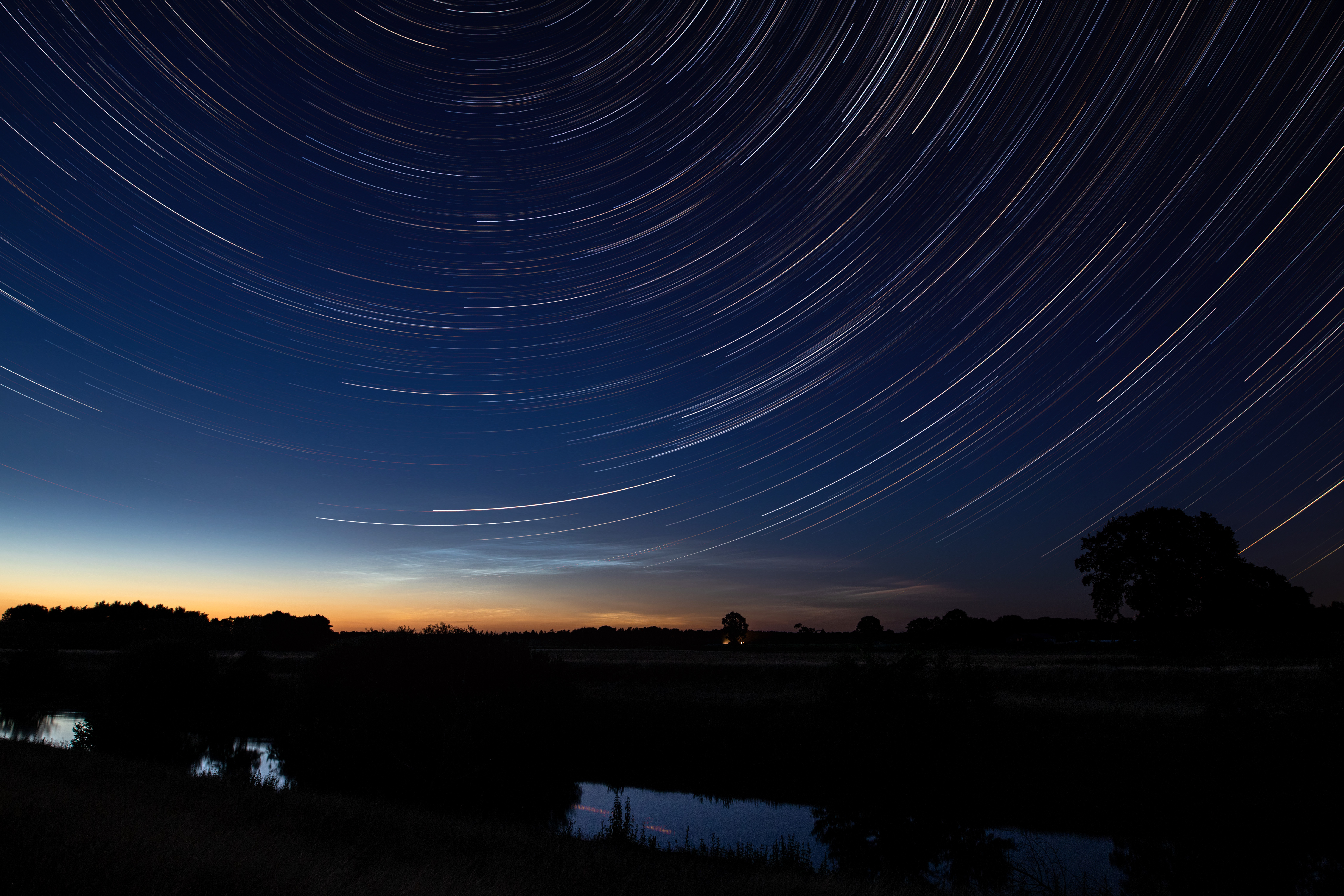 Leuchtende Nachtwolken in der Nacht vom 7. auf den 8. Juli 2018. Schon früh am Abend in der Dämmerung konnten die ersten Strukturen ausgemacht werden. So gegen 23:30 Uhr MESZ hatten die Leuchtenden Nachtwolken ihre maximale Helligkeit und hoben sich wunderbar gegen den dunklen Himmel ab. Bei dieser Aufnahme habe ich die Kamera noch länger laufen lassen und anschließend die Bilder der Leuchtenden Nachtwolken zu einem Startrail kombiniert.