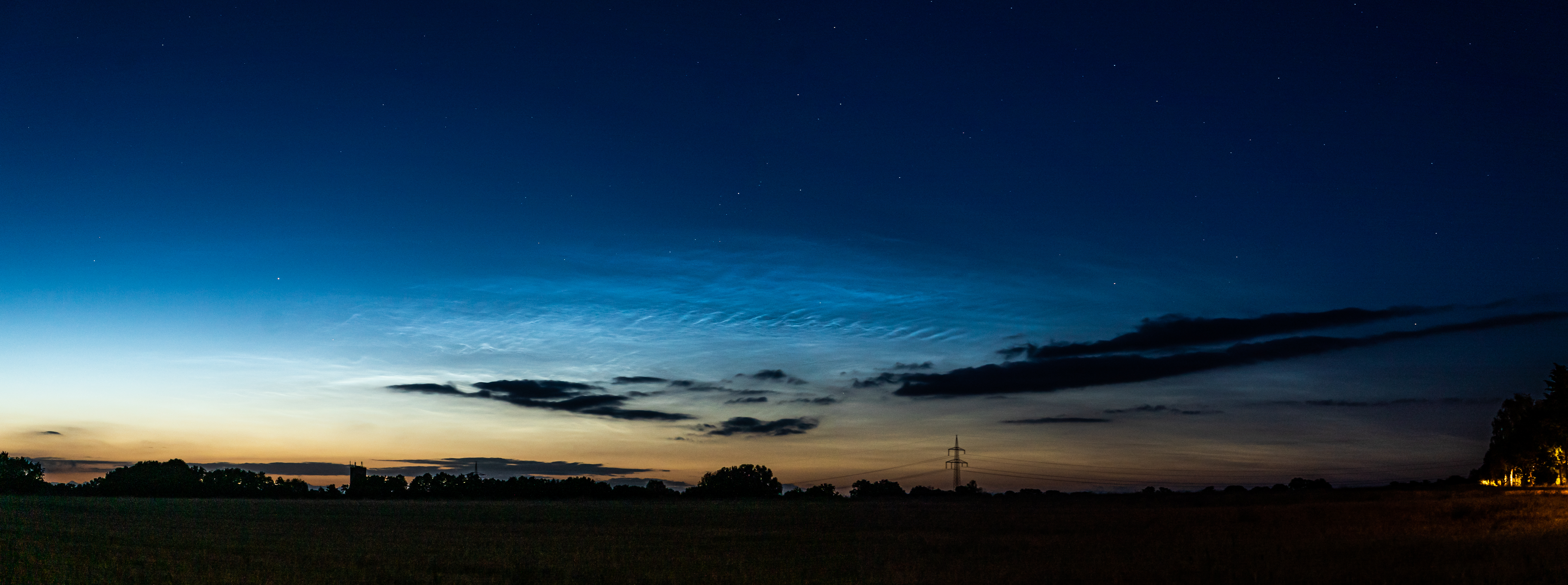Und hier noch ein Panorama: Kurz vor dem Schlafengehen schaute ich noch einmal auf eine NLC-Plattform. Kurz vor 23 Uhr hatte jemand ein schönes NLC-Foto eingestellt, das Minuten vorher aufgenommen wurde. Meine Kamera stand bereit und 200 Meter weiter auf dem Feld konnte ich bis Mitternacht schöne NLC-Impressionen aufnehmen. Beeindruckend waren wieder mal die Wellenformen.