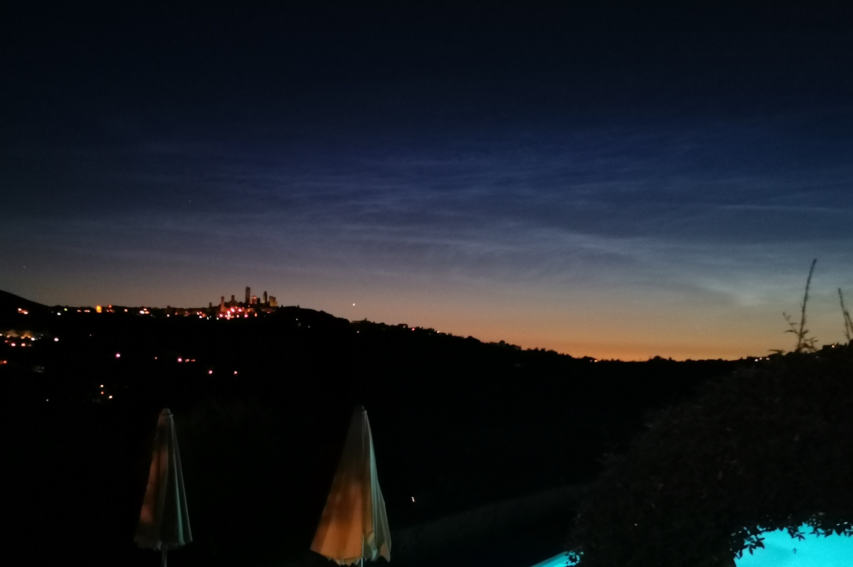 Am 25. Juni 2021 wollte mein Mann eine Astrokamera testen und die Venus über San Gimignano in der Toscana fotografieren. Kurz nach Sonnenuntergang deuteten sich die ersten NLC an, die wir hier nicht erwartet haben. Da das Weitwinkel nicht an die Astrokamera passte, habe ich mit meinem Smartphone eine Aufnahme versucht.