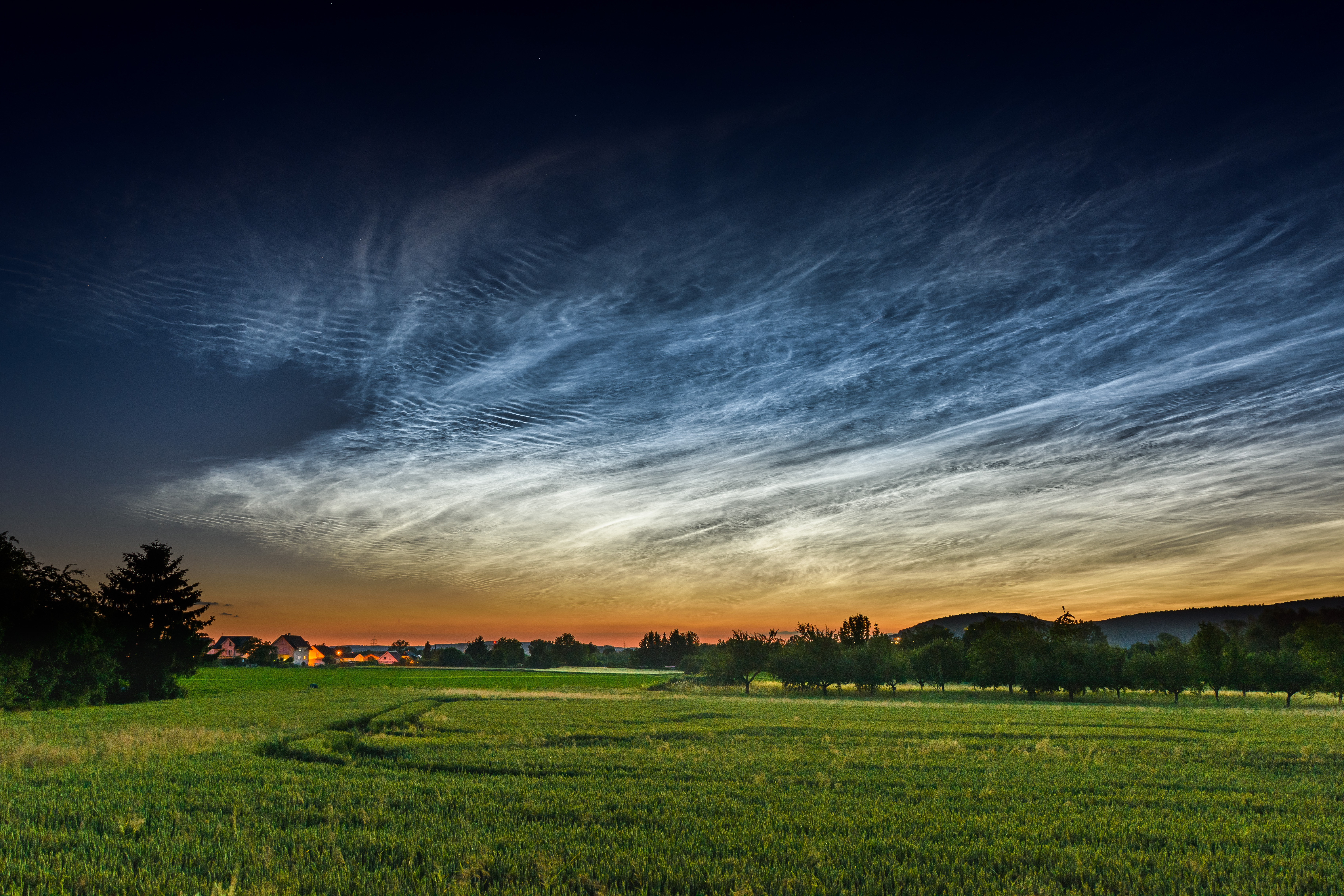 Unglaubliche helle NLC vom 21. Juni 2019 über Gelnhausen. Nikon D810, 14 mm Brennweite, 1 s, ISO 100, Blende 5,6