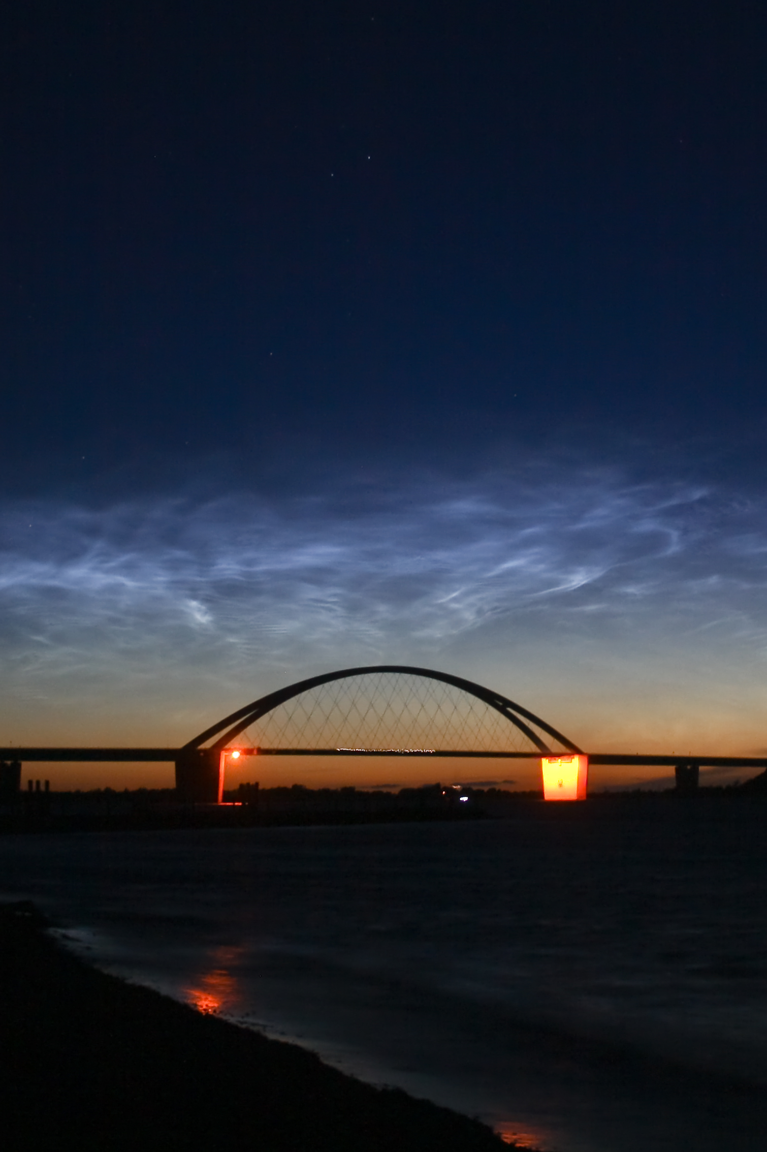 Am Abend des 10. Juli 2015 hatte die Fachwelt stärkere NLCs vorhergesagt. Aber wer hat schon Zeit sich um Mitternacht leuchtende Nachtwolken anzuschauen? In diesem Fall hatten mein Sternwartenkollege Stefan Bruns und ich Zeit dafür. NLCs zu fotografieren ist jedoch generell nicht so schwer. Besonders wird so ein Bild erst mit einem passenden Vordergrund. Hier bot sich uns wieder einmal die bekannte Fehmarnsundbrücke an. Schon auf der Fahrt konnten wir die ersten NLCs beobachten. Die dann entstandenen Bilder haben uns dann vollständig für die insgesamt drei Stunden Autofahrt entschädigt.