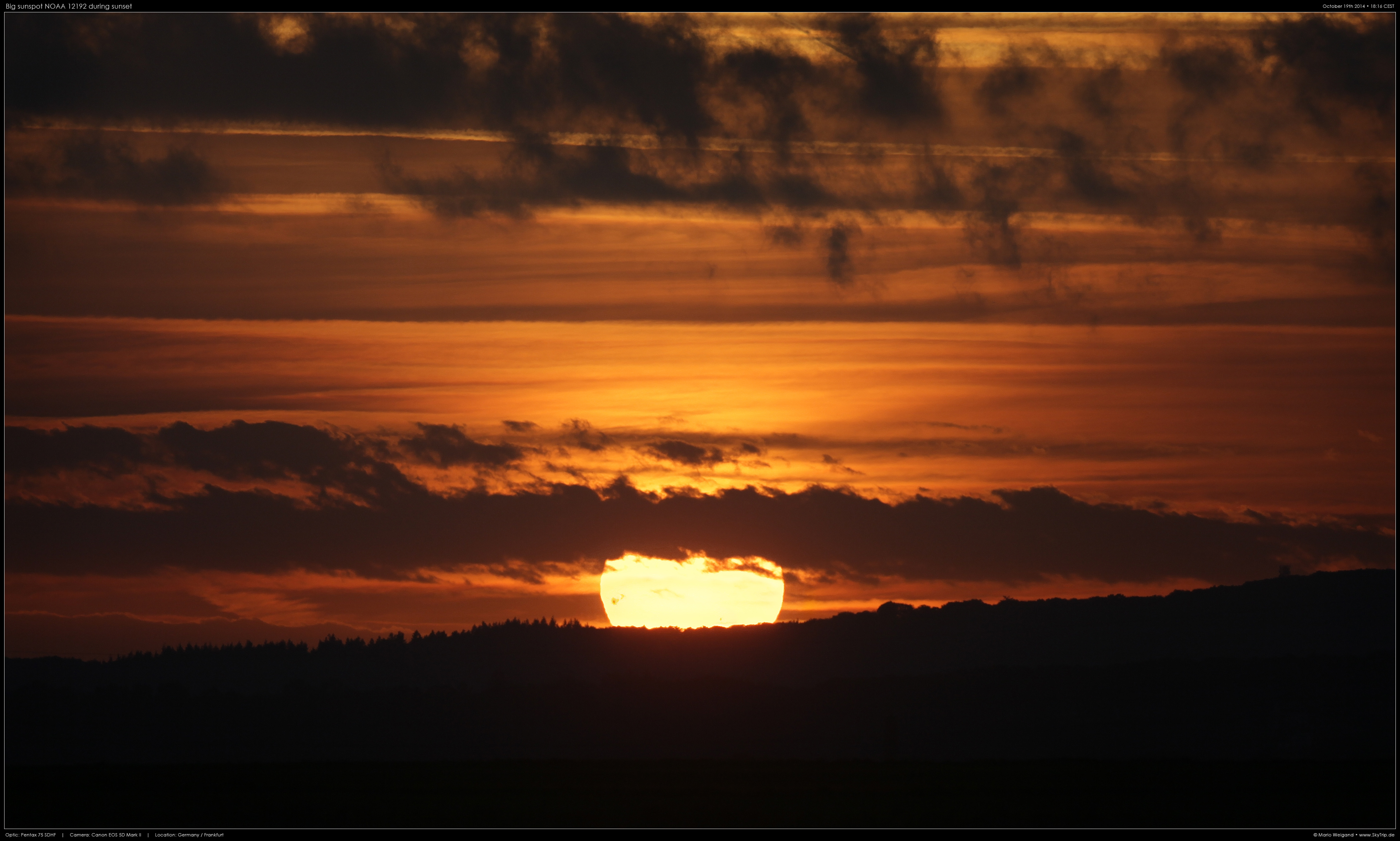 Am 17. Oktober 2014 kam es zu einem kleinen Höhepunkt in dem ansonsten eher schwachen Aktivitätszyklus: Die riesige Fleckengruppe NOAA 12192 tauchte am Sonnenrand auf. Am 19. Oktober war das Wetter gut und ich konnte einige Aufnahmen machen. Darunter auch dieser Schnappschuss bei Sonnenuntergang.