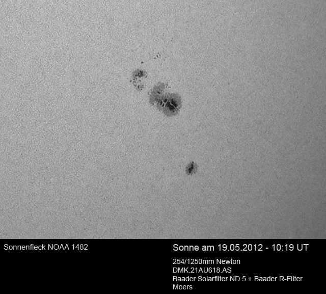 NOAA 1482 am 19.05.2012. Sonnenfleck aufgenommen mit 254/1250-Millimeter-Newton, Baader Solarfolie ND 5, DMK.21AU618.AS.
