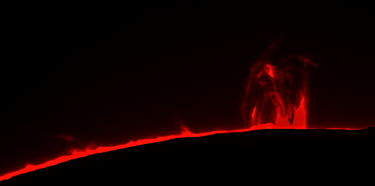 Am 21.4.2015 kam die Meldung des ersten M-Flares (von insgesamt sechs, fünf davon aus genau dieser Region). Ca. eine halbe Stunde nach dem Flare konnte ich diese Aufnahme der schönen Protuberanz über genau dieser Region einfangen.