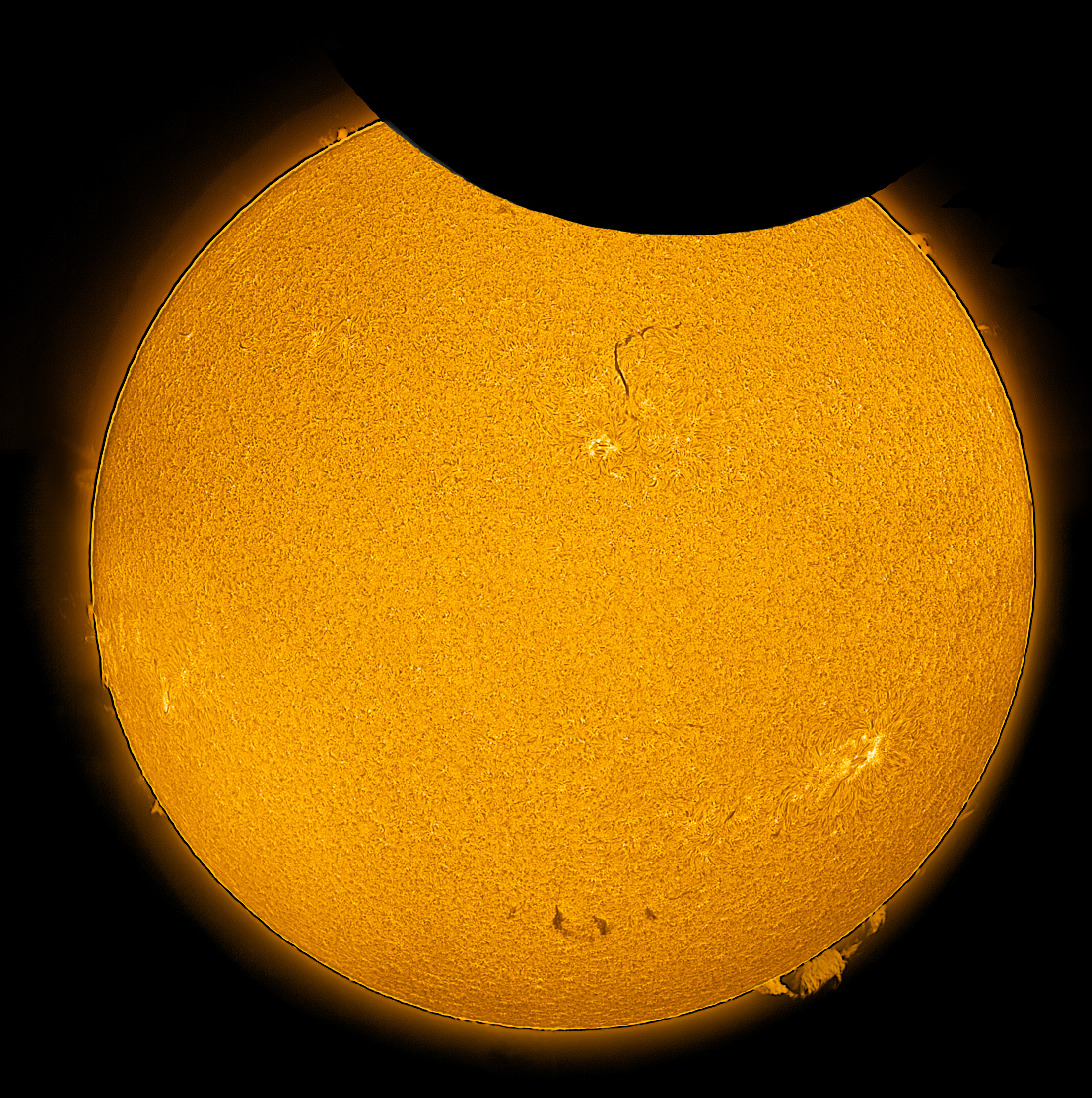 Das Bild zeigt die Bedeckungsphase um 10:48 UT an meinem Wohnort in der Schweiz. Die Filme für Oberfläche und Protuberanzen wurden kurz vor dem Beginn der Finsternis aufgenommen.
