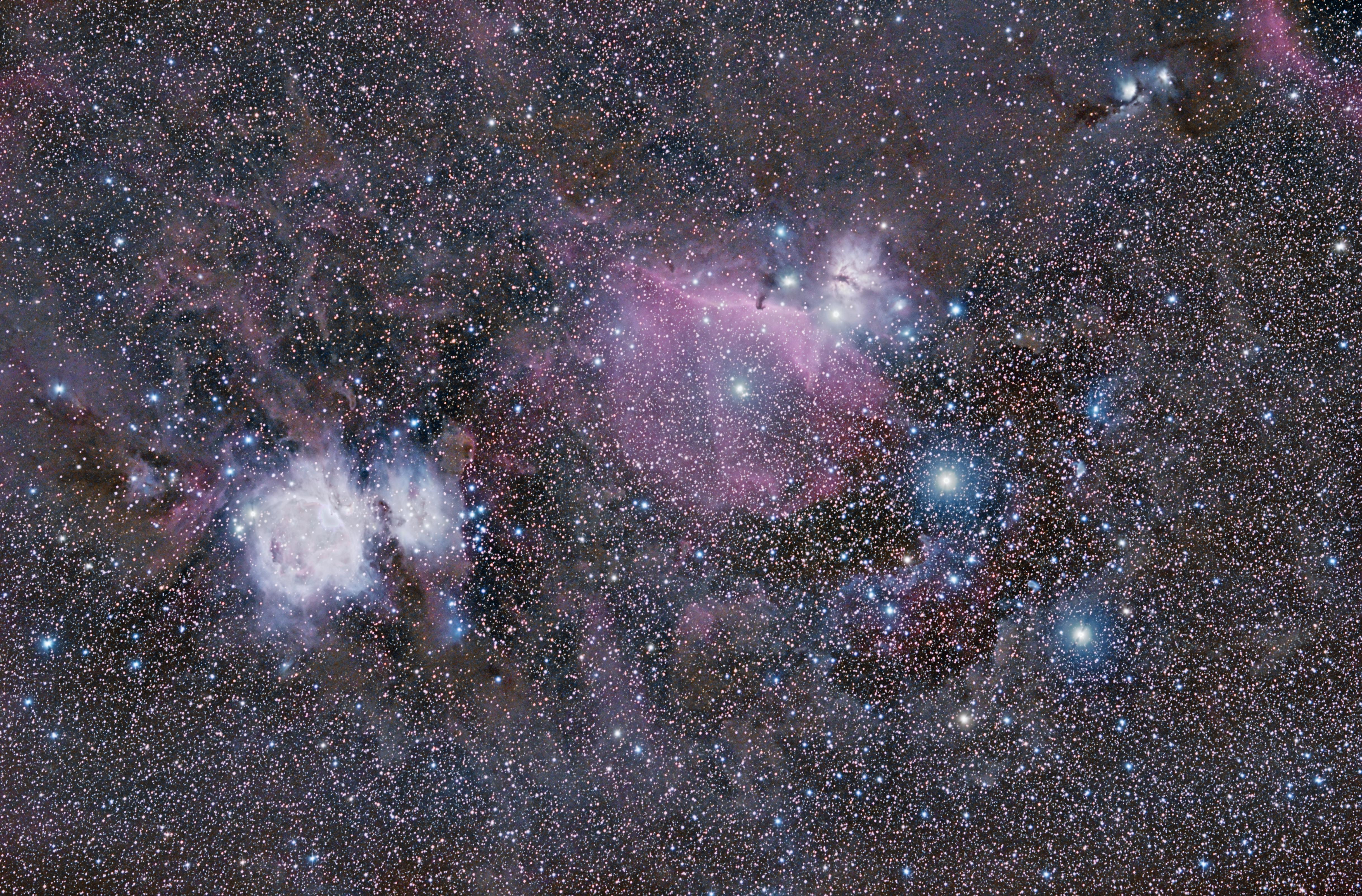 Wo macht sie also Urlaub? Auf La Palma lassen sich selbst subtile Staub- und Gaswolken fotografisch sichtbar machen mit annehmbarer Belichtungszeit bei einem phantastisch dunklen Nachthimmel. Es enstand diese Aufnahme in den frühen Morgenstunden des 24. Januar 2018, nachdem der Mond untergegangen war. Der Überblick im Bereich der Gürtelsterne des Orion zeigt neben zahlreichen bekannten Objekten auch großflächige Gas- und Staubwolken dieser aktiven Sternentstehungsregion. In dieser Version des Bildes wurden die Staub- und Gaswolken mit PixInsight gegenüber den Sternen noch etwas hervorgehoben