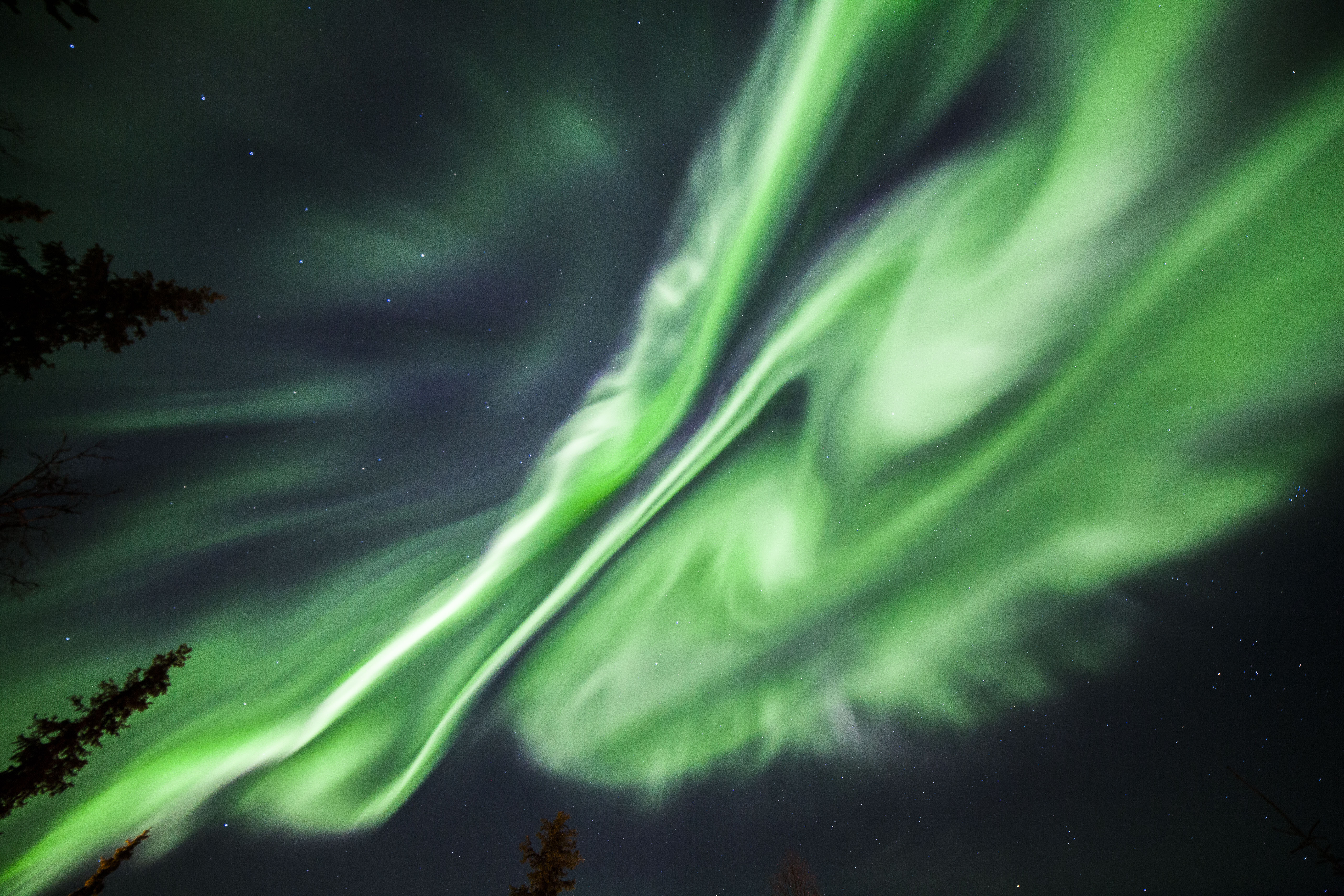 Auch in den Jahren geringer Sonnenaktivität lassen sich nahe des Polarkreises Nordlichter beobachten. Während unseres Winterurlaubs im finnischen Äkäslompolo hatten wir so mehrmals das Vergnügen, sehr aktive Nordlichter zu sichten. Bei dieser Aufnahme wurde die Kamera senkrecht nach oben gerichtet. Links oben ist der Große Wagen zu sehen, in der Mitte oben der Polarstern. Rechts unten befinden sich die Hyaden mit dem gelb leuchtenden Aldebaran und darüber die Plejaden.