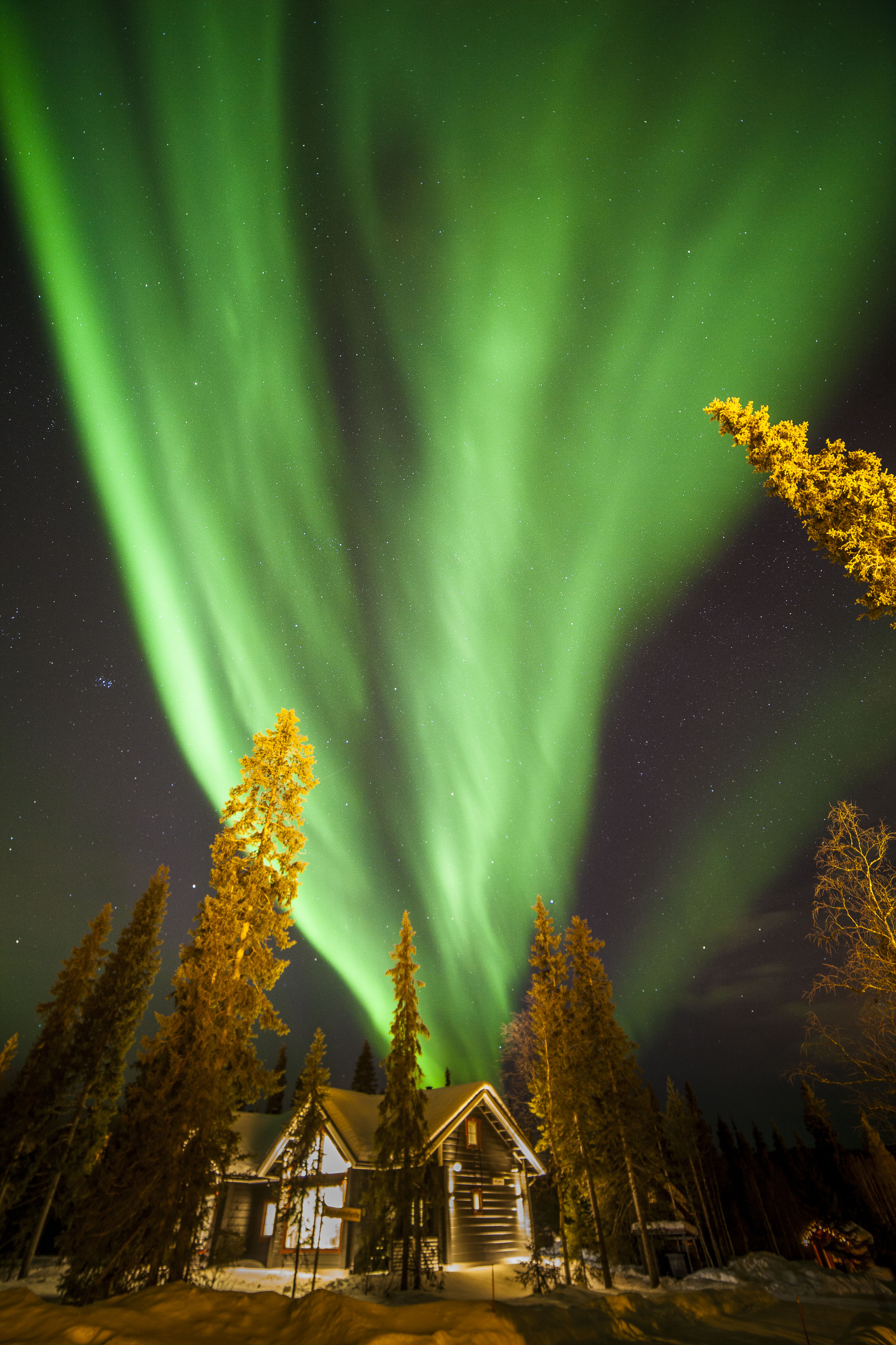 Auch in den Jahren geringer Sonnenaktivität lassen sich nahe des Polarkreises Nordlichter beobachten. Während unseres Winterurlaubs im finnischen Äkäslompolo hatten wir so mehrmals das Vergnügen, sehr aktive Nordlichter zu sichten. Bei dieser Aufnahme wurde eine Kamera mit einem starken Weitwinkelobjektiv von 14 mm verwendet. Dadurch lassen sich die Himmelserscheinungen in ihrer enormen Ausdehnung ablichten. Das Bild zeigt Nordlichtvorhänge, die sich manchmal über den gesamten Himmel erstreckten. Hier verlaufen sie vom Horizont durch den Zenit. Links im Bild sind die Plejaden zu sehen.