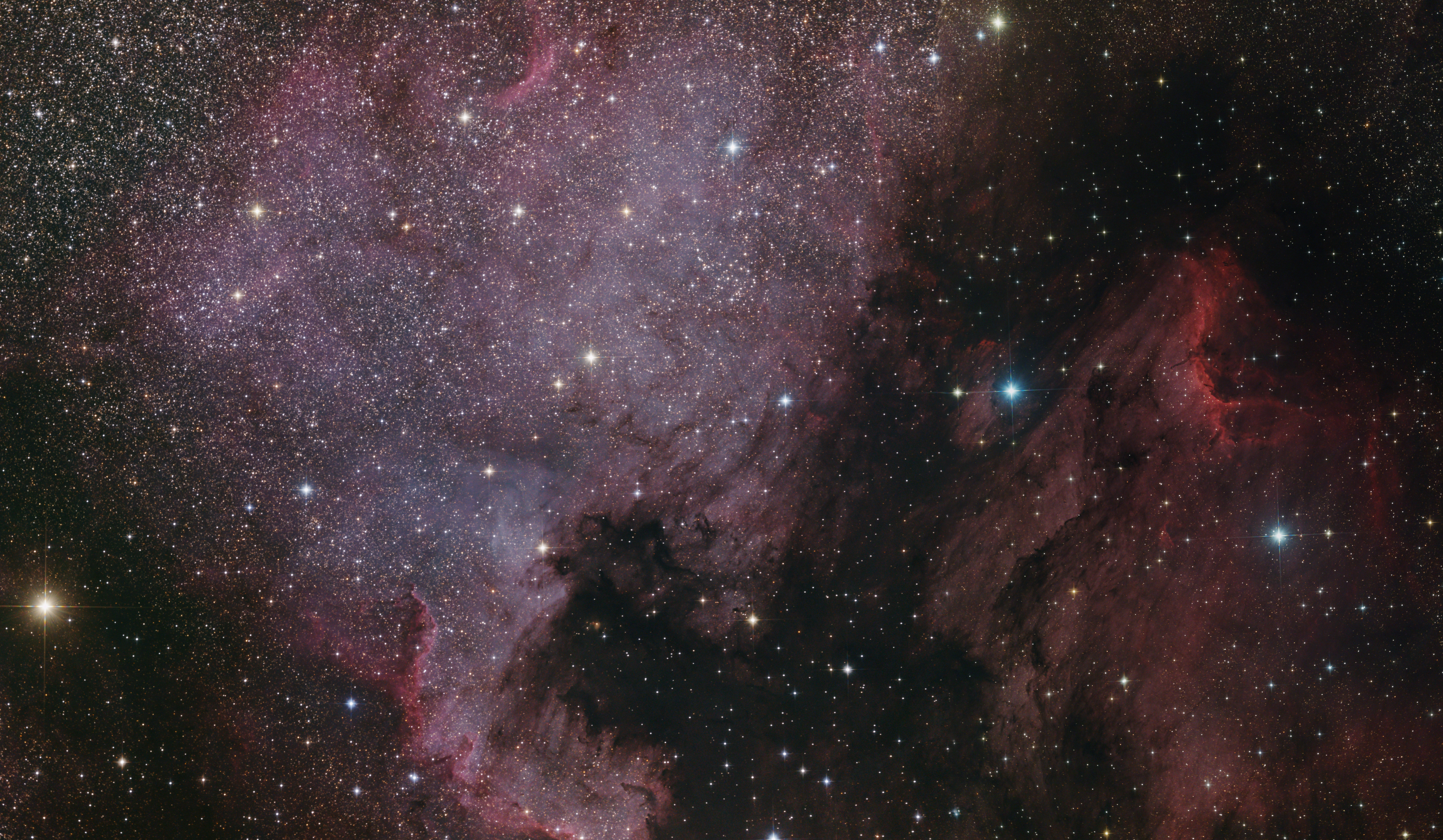 Bei einer Aufnahmebrennweite von 1000 mm und einer Vollformat-DSLR erfordert das Bildfeld für Pelikan- und Nordamerikanebel zusammen ein Mosaik. Hier zunächst das reine RGB-Bild.