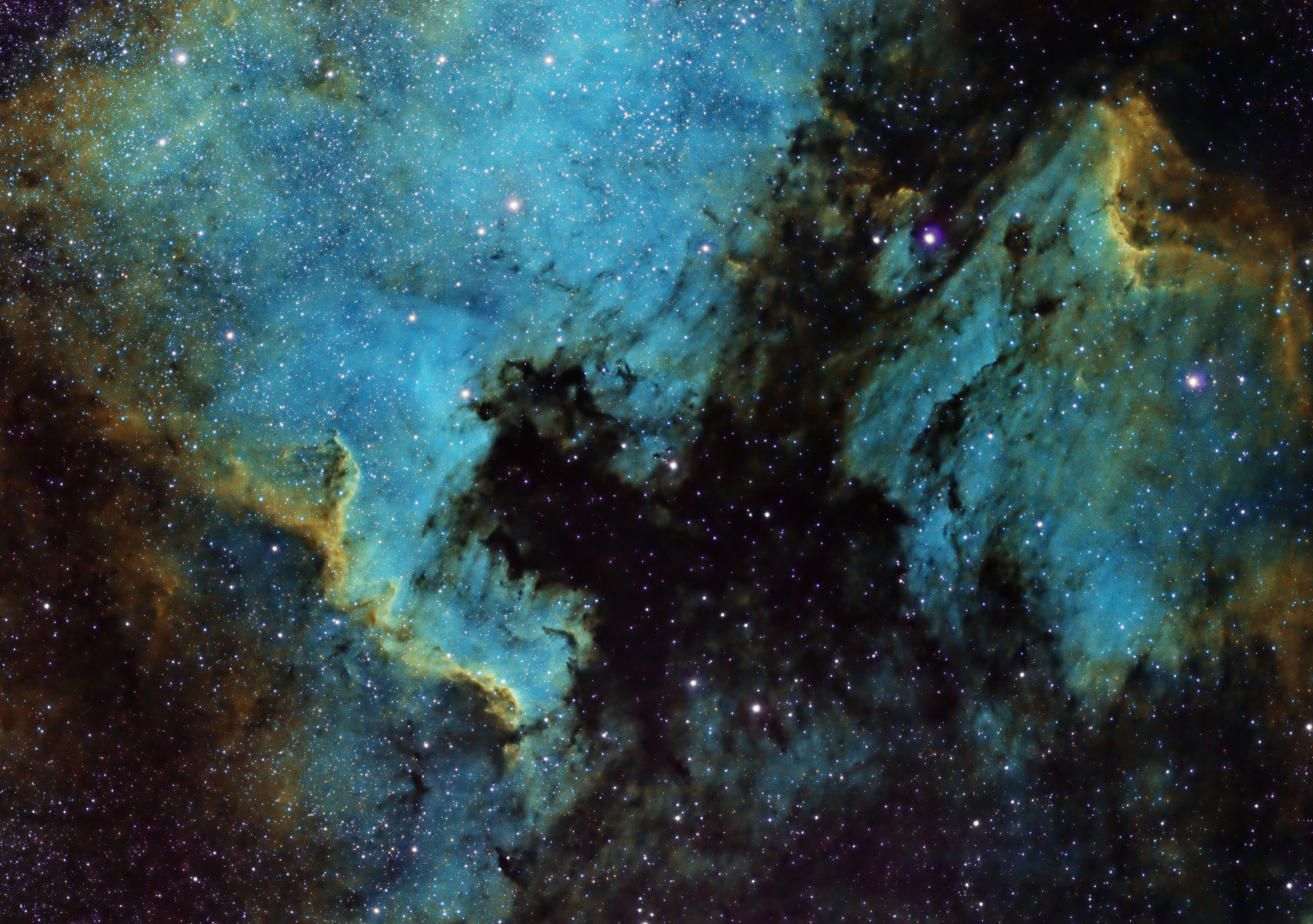 Das Bild zeigt den bekannten Nordamerikanebel zusammmen mit dem Pelikannebel aus dem Sternbild Schwan. Die Farben sind synthetisiert aus den Schmalbandkanälen gemäß Hubble-Palette (Rot = SII, Grün = H-alpha, Blau = OIII) mit anschließender selektiver Farbkorrektur in eine Gold/Türkis-Färbung. Ich hatte mich anfangs erst nicht getraut, Schmalbandaufnahmen mit einer ungekühlten DSLR-Kamera auf einer Astrotrac ohne Guiding bei f/5,6, f = 400 mm zu wagen. Es hat mich aber dann doch überrascht, wie relativ problemlos alles funktionierte.