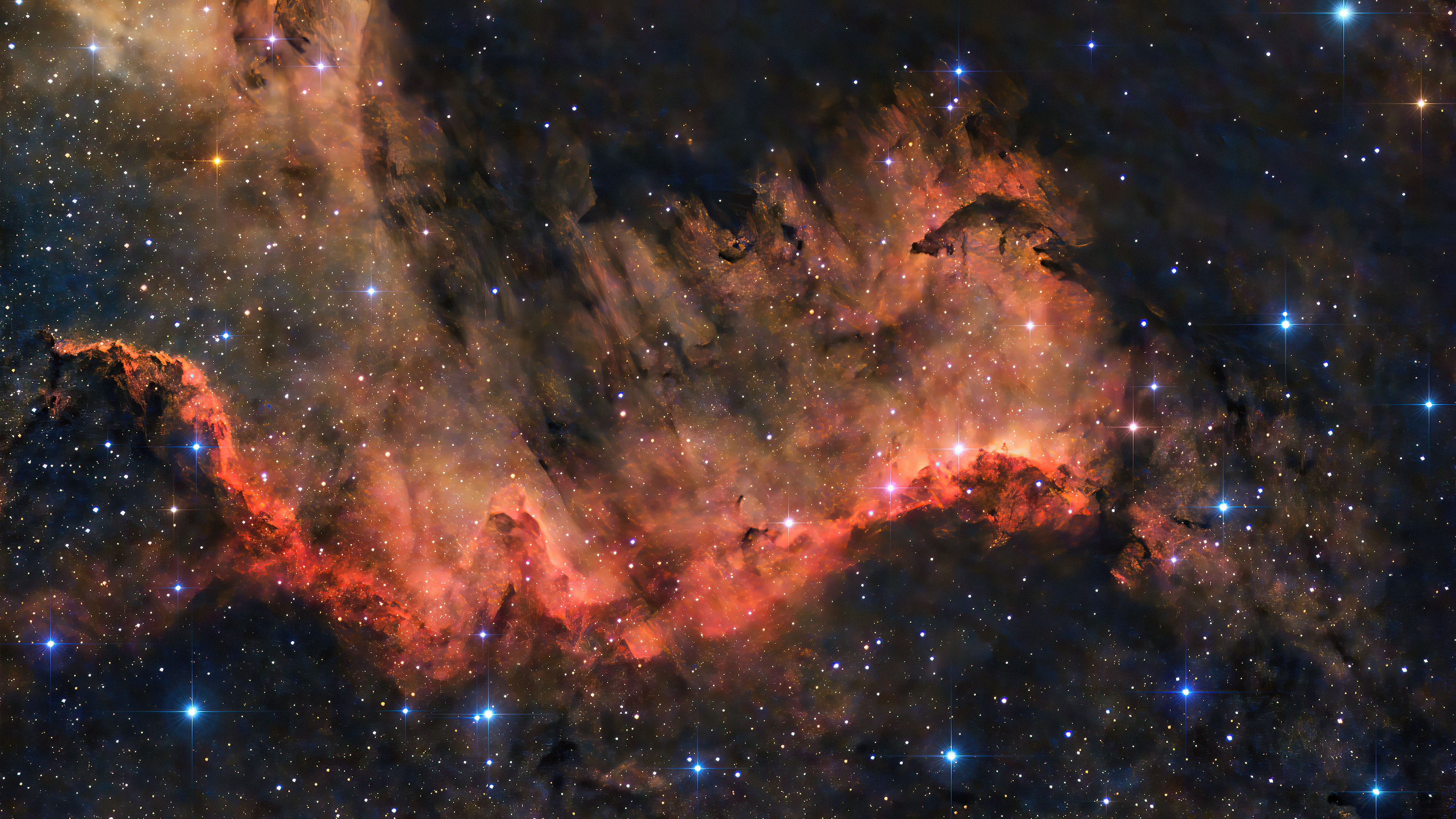 Aufnahmedauer: 3 Nächte aus der Innenstadt heraus (Bortle 6). NGC 7000 ist eine ausgedehnte, ionisierte Gaswolke im Sternbild Schwan, die vom UV-Licht naher Sterne zum Leuchten angeregt wird. Seinen Namen Nordamerikanebel (NGC 7000) erhielt der Nebel aufgrund seiner Form, die an eine Landkarte des nordamerikanischen Kontinents erinnert. Ich zeige einen Ausschnitt hiervon, der häufig auch die große Wand (The Great Wall) genannt wird. Der Gasnebel ist zwischen 2000 und 3000 Lichtjahren entfernt (seine genaue Entfernung ist wegen seiner Ausdehnung nur schwer zu bestimmen) und besteht überwiegend aus Wasserstoff, der teilweise in ionisierter Form auftritt und sichtbares Licht in Form von tiefroter Strahlung emittiert.