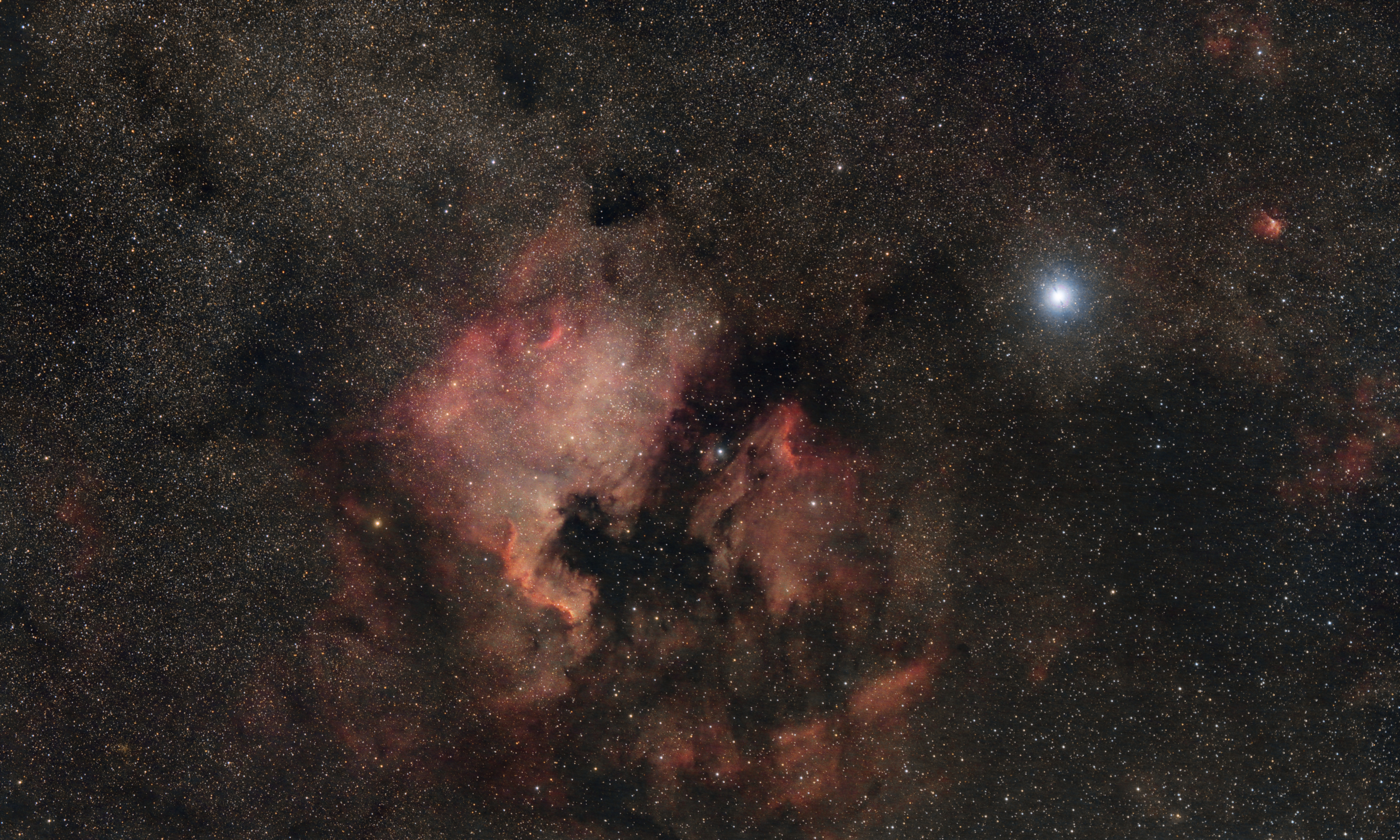 Zum Glück ließ die zweite Hälfte des Augusts einiges an Astrofotografie zu. So kamen in einer Nacht diese vier Stunden Belichtungszeit am Nordamerikanebel NGC 7000 und dem Pelikannebel IC 5070 zustande. Der auffällige, helle Stern rechts ist Deneb im Sternbild Schwan. Dieser dient dem Astrofotografen sehr gut als Anhaltspunkt für die Einstellung des Framings, auch wenn man wie ich in diesem Fall keine Go-To-Funktion an der Montierung hat.