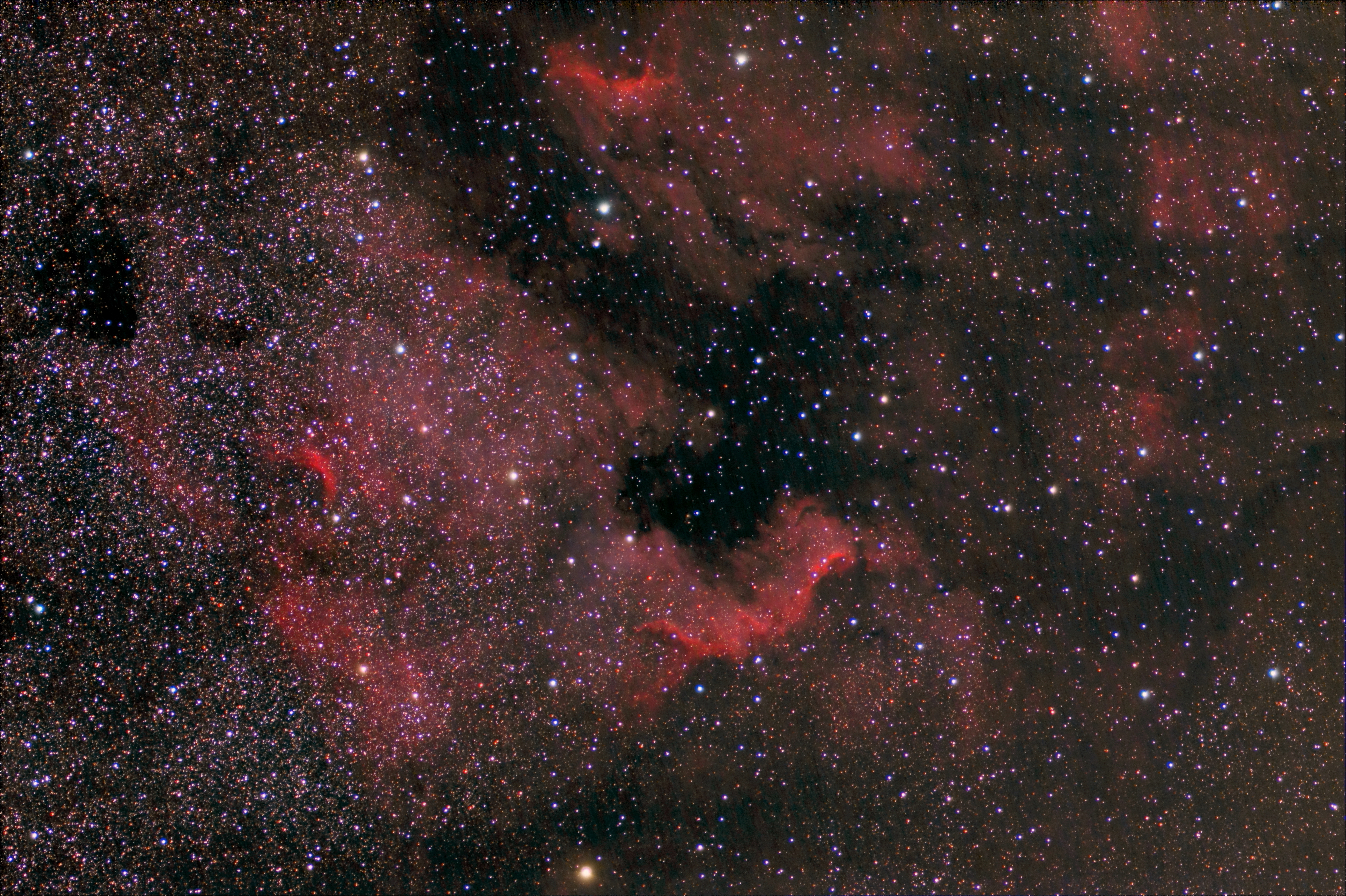 Endlich ist es mir gelungen, den Klassiker unter den Emissionsnebeln vernünftig in einem Bild unterzubringen. 300 mm Brennweite an APS-C passten da recht gut. So war auch noch Platz für den Pelikannebel.