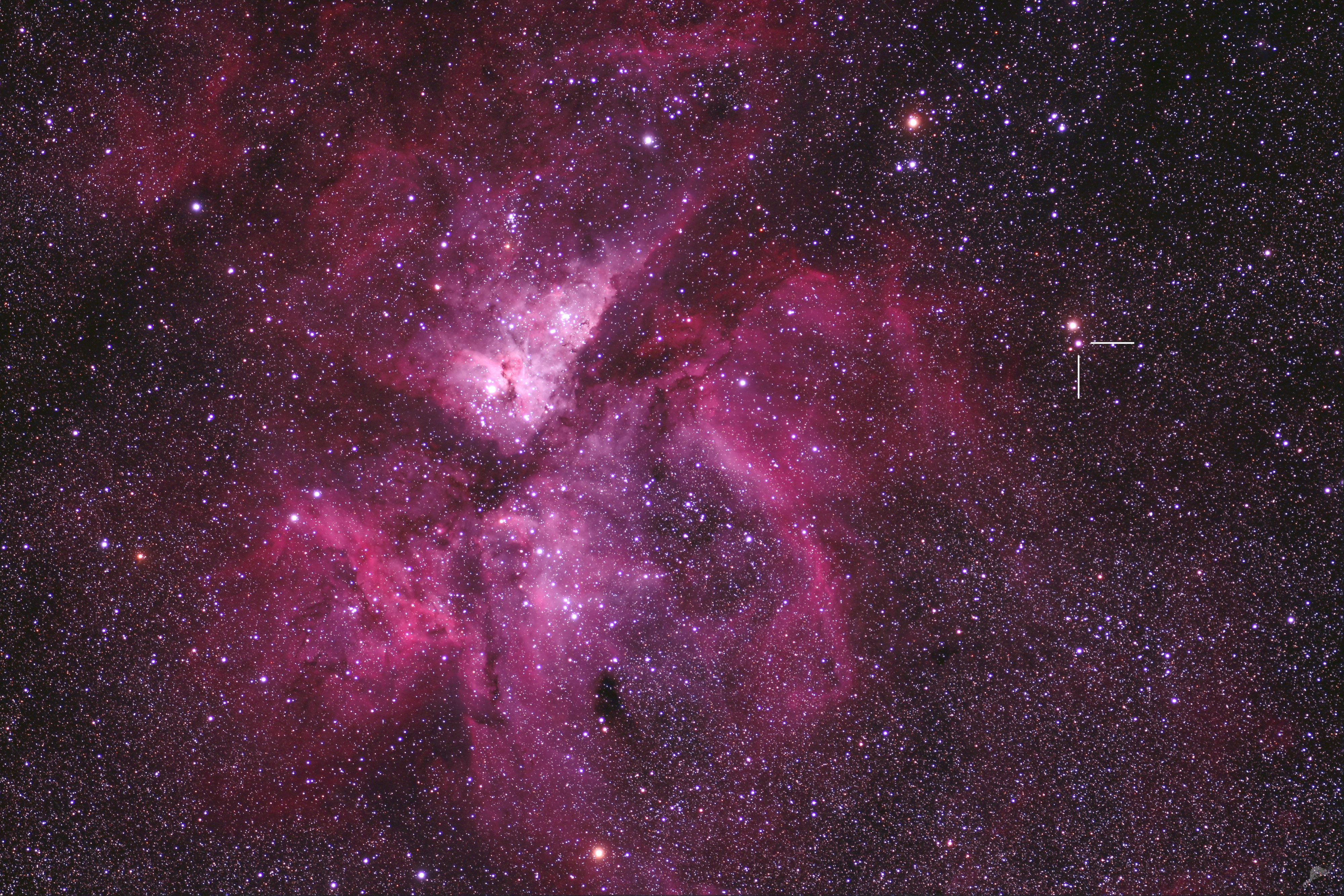 Die Nova Carinae 2018 (markiert) am 4. April 2018 direkt neben dem beeindruckenden Carinanebel, der diesmal eine ungewohnte Nebenrolle im Bild spielt.