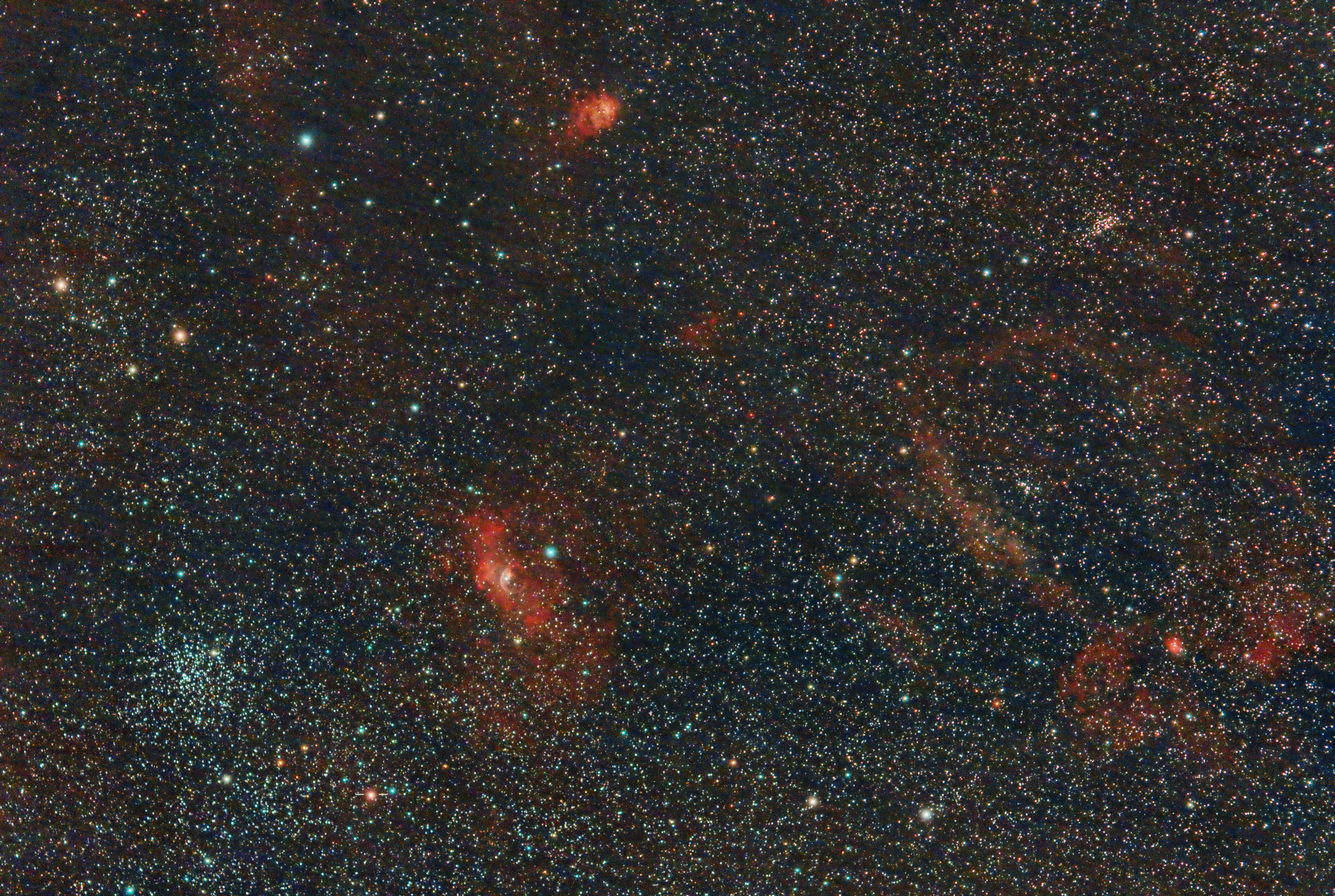 Die Aufnahme entstand bei recht gutem Himmel direkt in Graz. Die Nähe vieler interessanter Objekte (von links: Messier 52, Blasennebel NGC 7635, nördlicher Lagunennebel NGC 7538, Hummerscherennebel Sh2-157, NGC 7510) macht die Nova zu einem tollen Motiv.