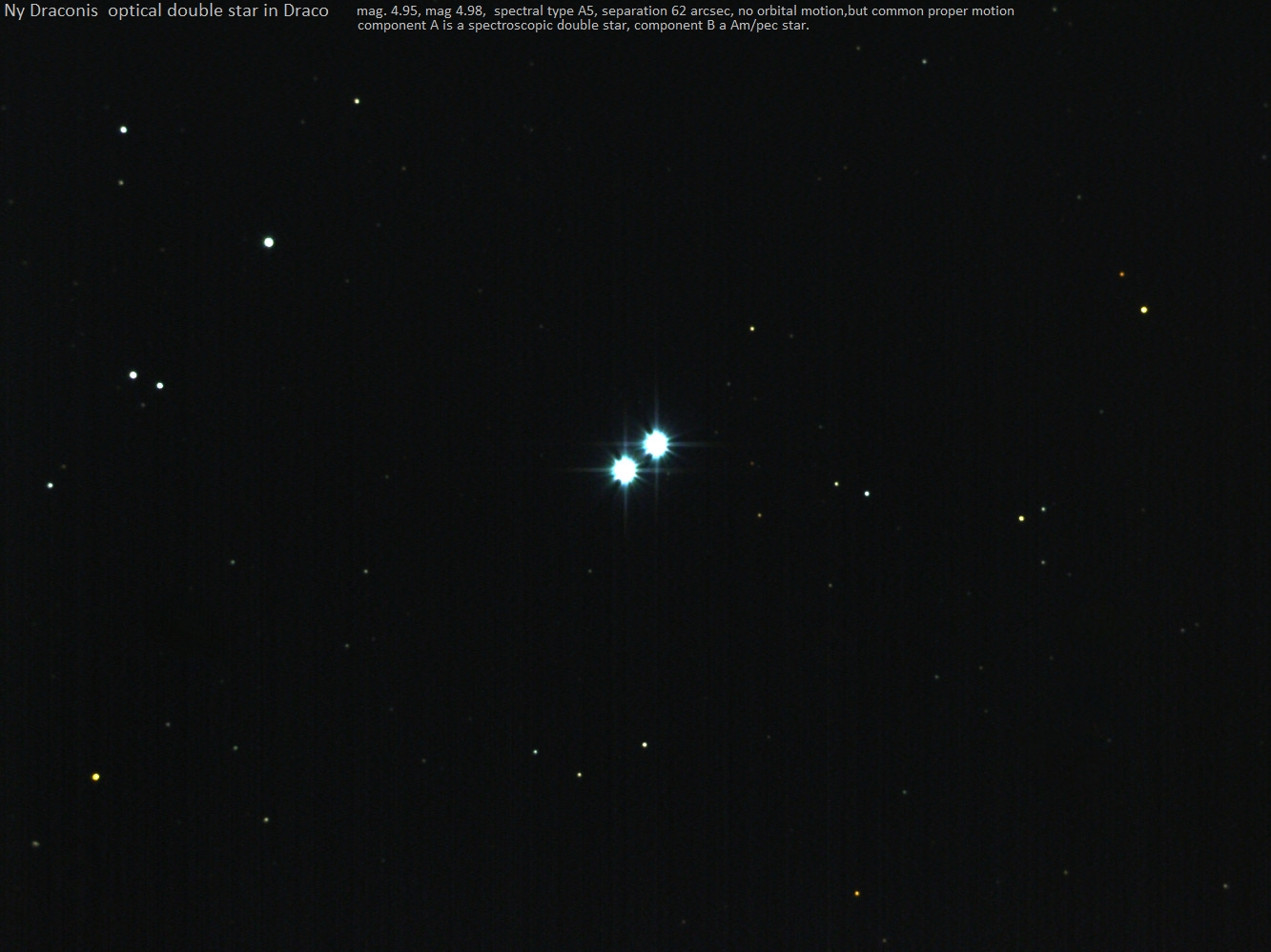 Ny Draconis ist ein schöner optischer Doppelstern mit gleichhellen Komponenten in fast genau einer Bogenminute Abstand und ein schönes Feldstecherobjekt.
