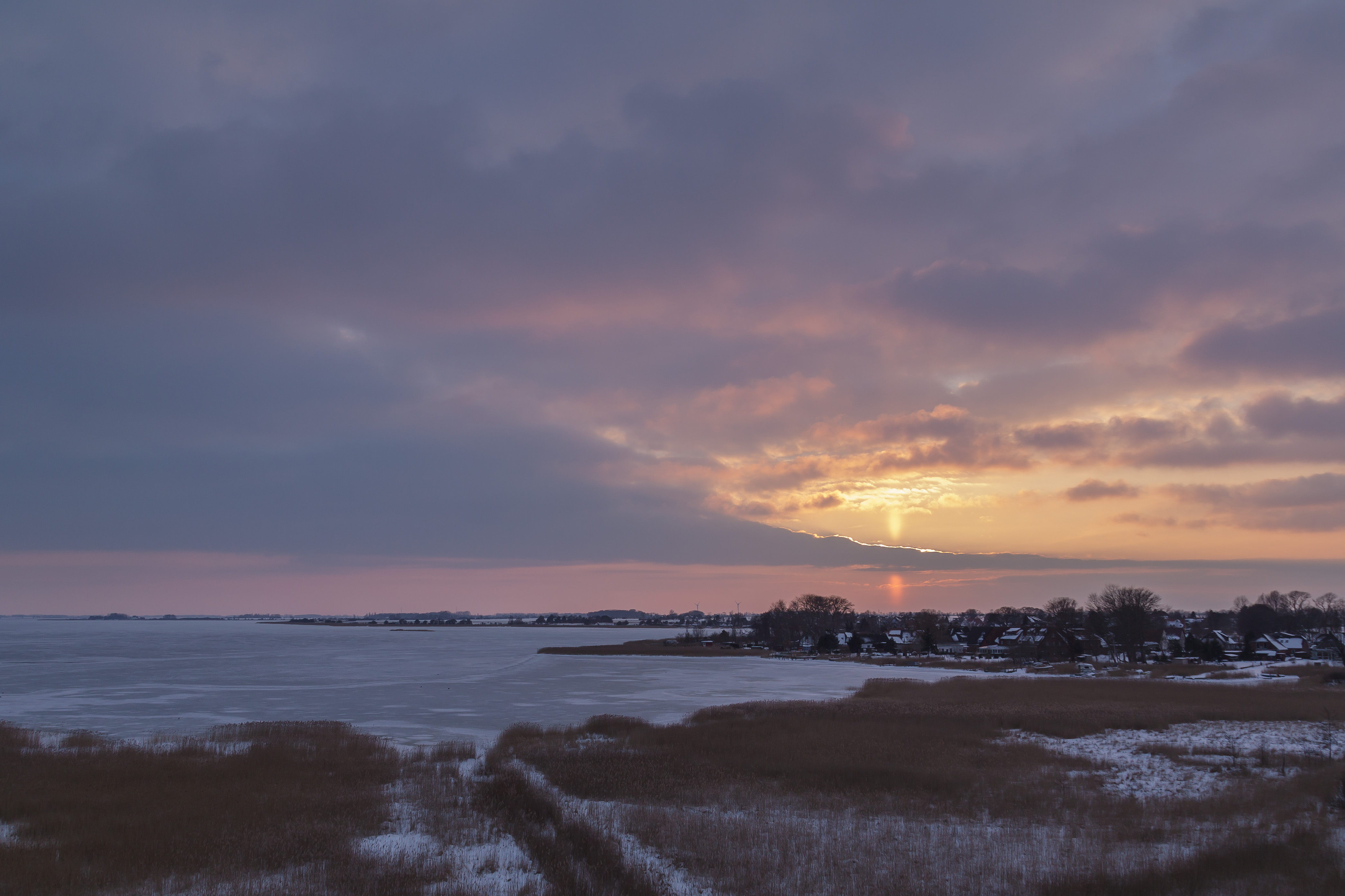 Über dem Breeger Bodden (Rügen) zeigte sich am 3. März 2018 um 18:36 Uhr MEZ diese atmosphärische Erscheinug mit einer seltenen Kombination aus einer oberen und unteren Lichtsäule.