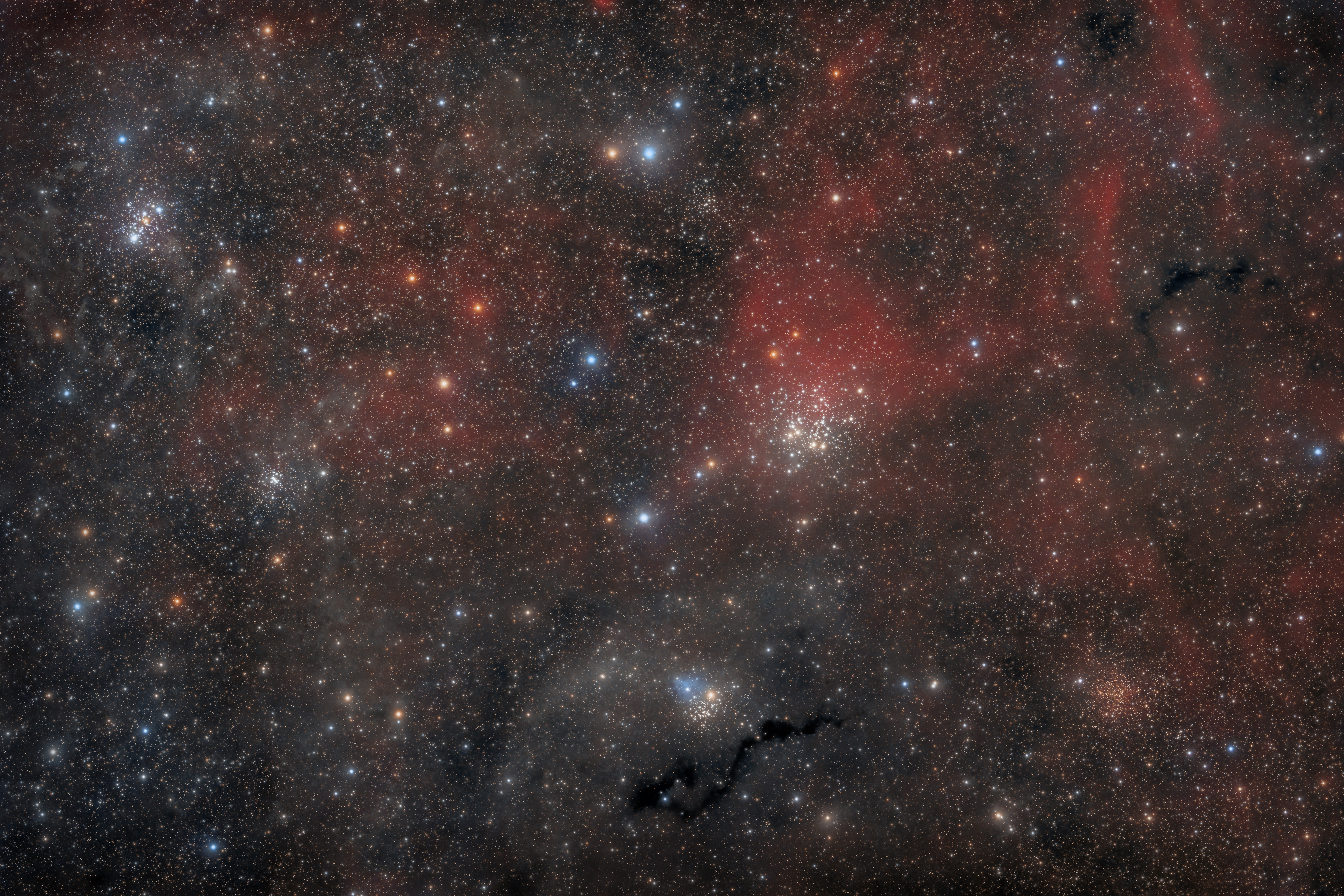 Das Gebiet um die offenen Sternhaufen NGC 654, NGC 659, NGC 663 und IC 166 im Sternbild Kassiopeia ist ein wunderschönes Ziel am Nachthimmel, in dem auch noch ein paar eindrucksvolle Dunkelnebel wie zum Beispiel LDN 1337 zu sehen sind. Wer genau hinschaut, entdeckt im unteren Teil des Bildes oberhalb des Dunkelnebels noch den kleinen Reflexionsnebel VdB 6. Meistens wird dieser Bereich in reinem RGB aufgenommen. Ich hatte aber auf ein paar Fotos leichte H-Alpha-Wolken gesehen, so dass mich dazu entschied, zusätzlich zu den knapp 8,5 Stunden RGB auch noch 2,5 Stunden H-alpha aufzunehmen. Bei der Bearbeitung konnte ich schließlich die funkelnden Sternhaufen, die geheimnisvollen Dunkelnebel, Staub, Reflexionsnebel und H-Alpha zu einem fertigen Bild kombinieren, dass dieses Gebiet mal in einem anderen Licht erscheinen lässt.