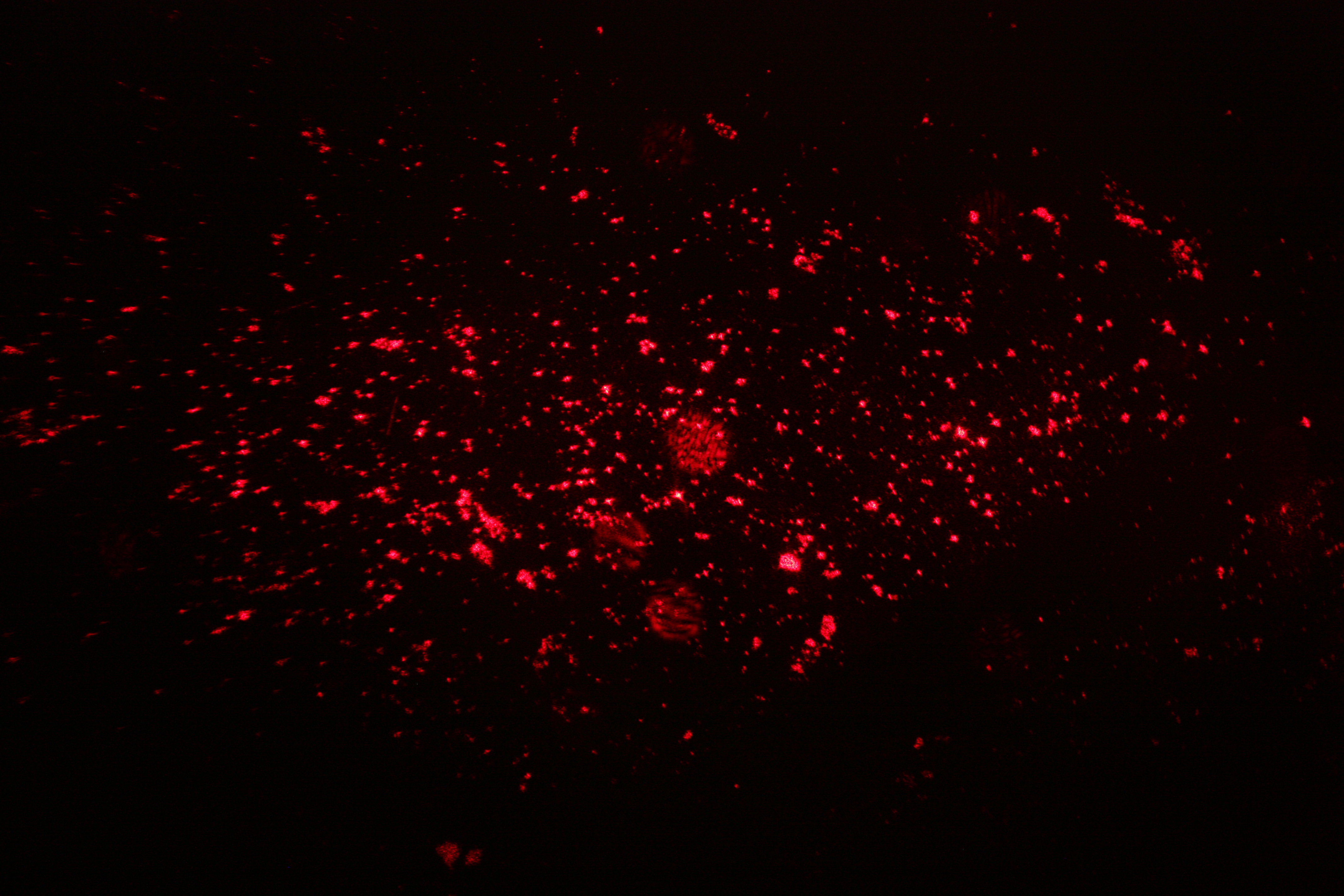 Kein offener Sternhaufen. Es handelt sich um kolloidales Silber. Winzige Silberpartikel leuchten im roten Laserlicht unter dem Mikroskop. Wie im Kleinen, so im Großen, wie im Mikrokosmos, so im Makrokosmos. Analogiegesetz.