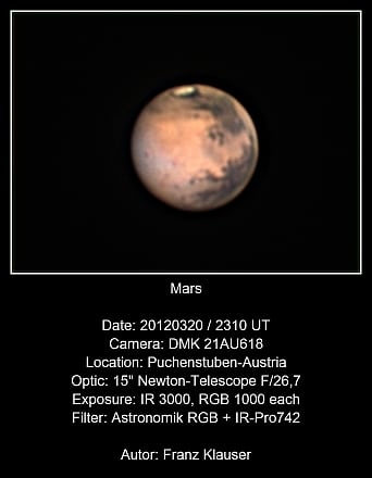 2 Wochen nach der Oppositionsstellung des Mars war dessen Durchmesser noch groß genug, um entsprechende Details erkennen bzw. fotografieren zu können. Deutlich zeigt sich Olympus mons in seiner ganzen Ausdehnung links im Bild. Man vergleiche dazu die beiden Aufnahmen vom 19.4.2012.