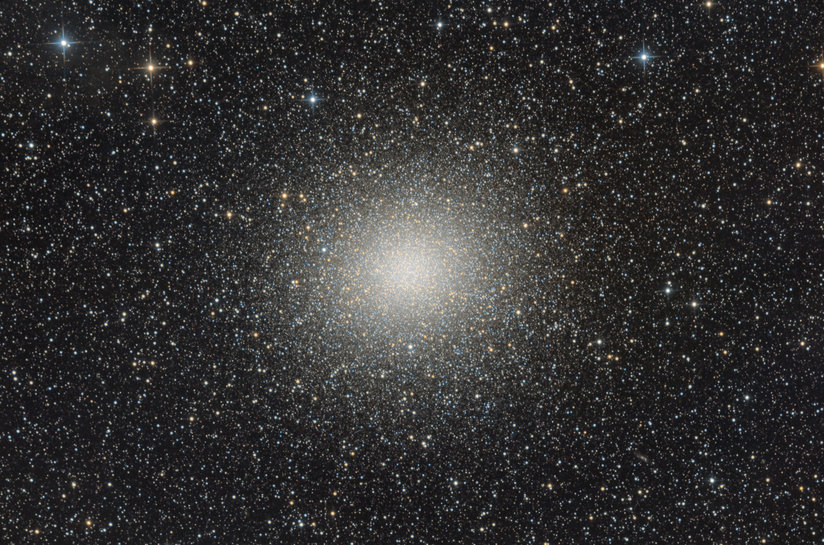Fünf Grad tiefer als Centaurus A liegt Omega Centauri, auf etwa 13 Grad. Dieser riesengroße Kugelsternhaufen war Ziel der ersten Tage, 28. Mai bis 1. Juni, auf La Palma. Über fünf Tage hinweg hab ich insgesamt 5,7 h Belichtungszeit gesammelt und das ganze bei F2.8. (124 min L, 71 min R, 74 min G, 72 min B). https://www.lexpics.de/astrofotografie/ngc-katalog/omega-centauri/