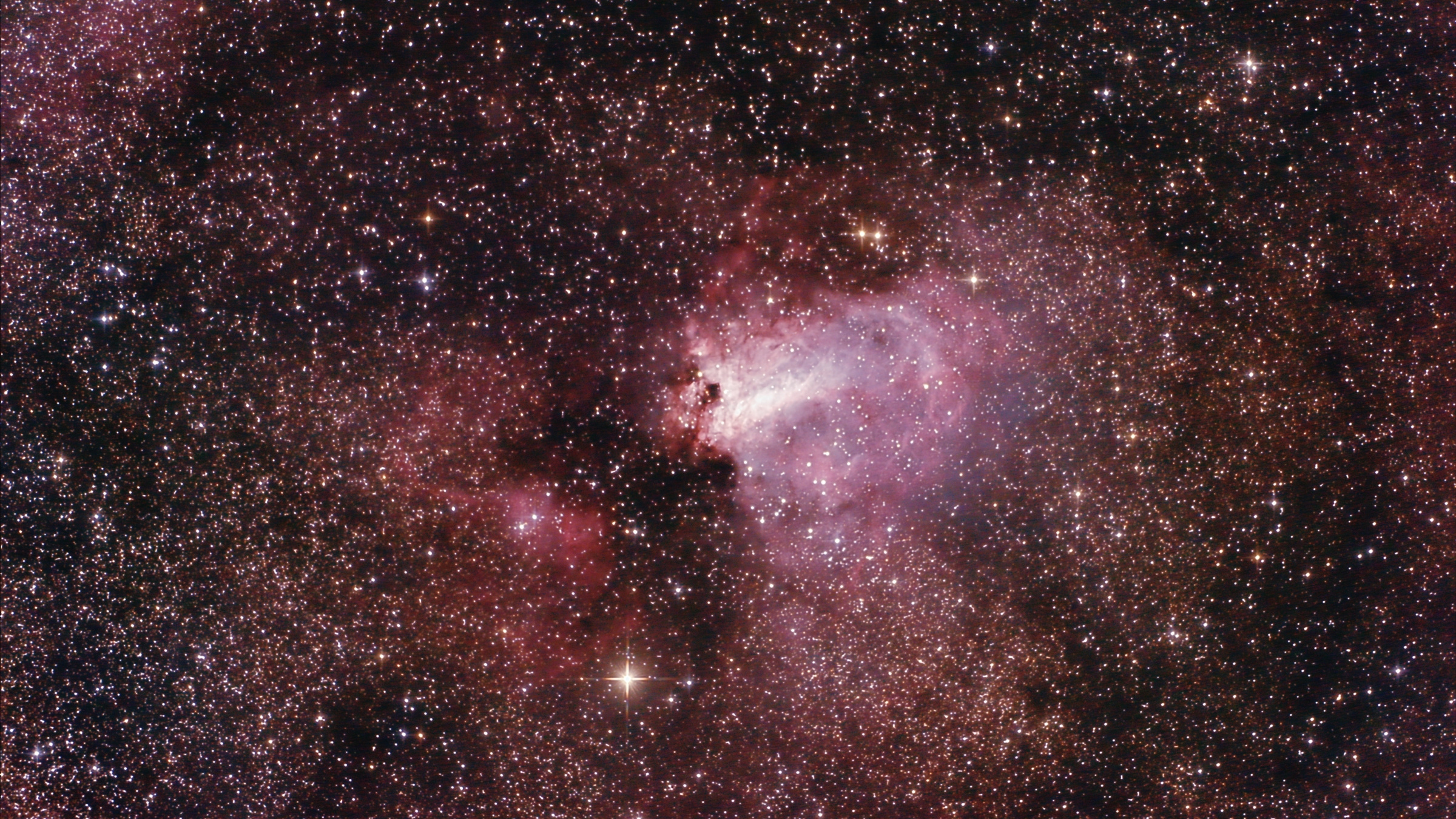 The Omega Nebula (M 17), also known as the Swan Nebula, is a interstellar cloud of ionized hydrogen observable to 5000 lightyears away toward the center of our Milky Way in the constellation Sagittarius. It was discovered by Jean-Philippe de Chéseaux in 1745 and is considered one of the brightest and most massive star-forming regions of our galaxy. It has a geometry similar to the Orion Nebula, except that instead of be viewed face-on, Omega is viewed edge-on. The open cluster NGC 6618 lies embedded between the nebulosity and causes the gases of the nebula to glow due to radiation from these young stars.