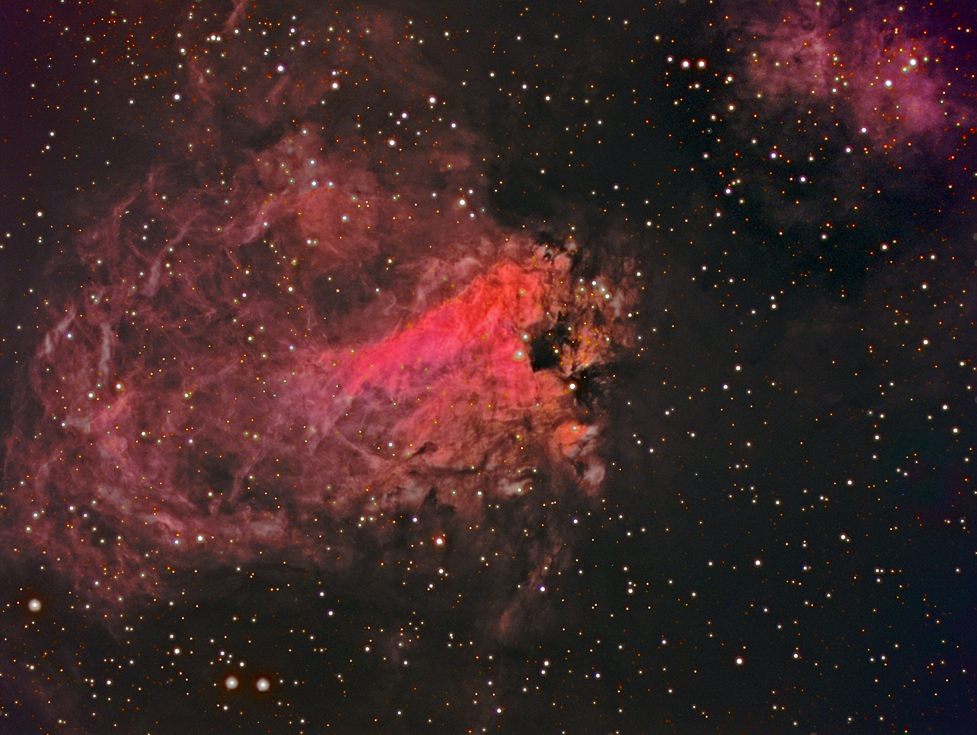 M 17 ist bei uns im Norden kein einfach aufzunehmendes Objekt, da er nur in den kurzen Sommernächten und dann dicht über dem Horizont in rund 20 Grad Höhe erscheint. Die knapp drei Stunden Dunkelheit in der Nacht vom 31. Juli zum 01. August reichten dann gerade aus, um ihn im H-alpha-Licht und den drei Farben aufzunehmen.