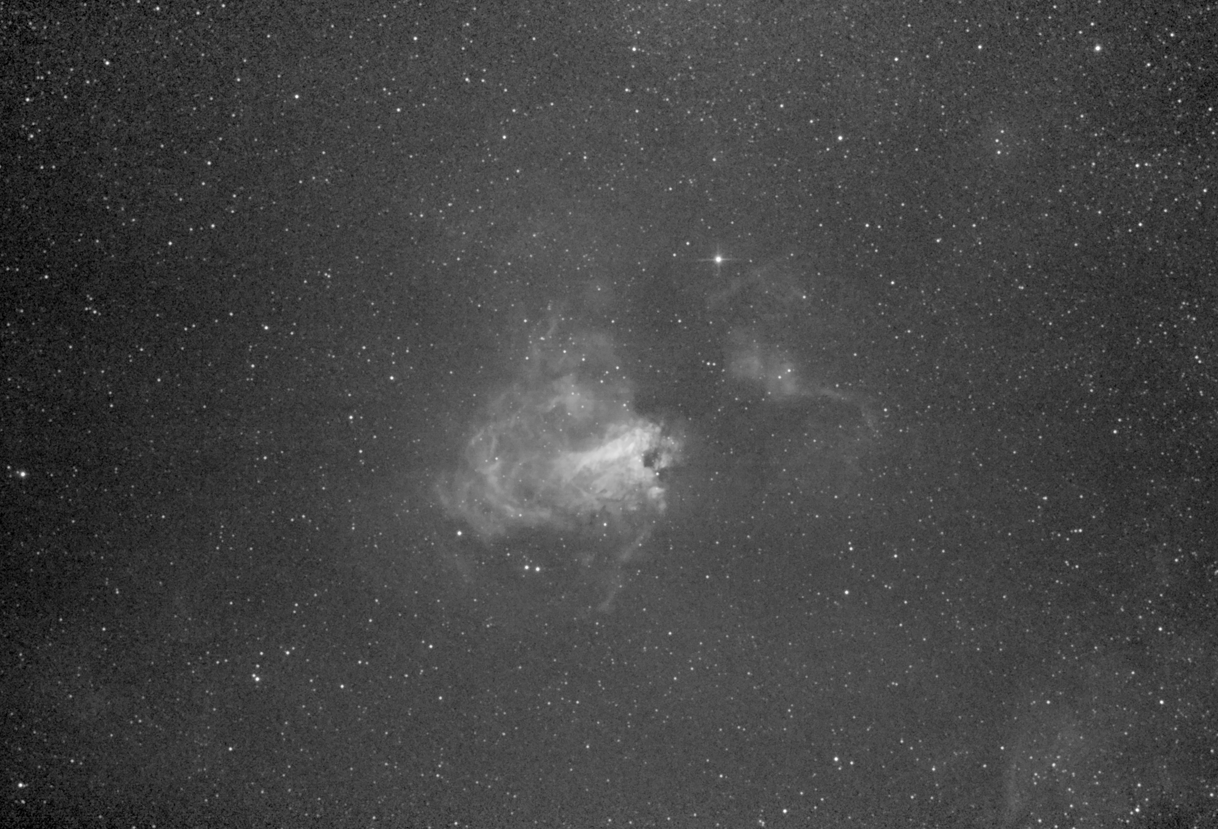 Zuletzt hatte ich meine (Farb-) Aufnahme des Omeganebels Messier 17 in die hiesige Leserbildgalerie hoch geladen. Dabei hatte ich erwähnt, dass bei der Bildverarbeitung auch H-Alpha-Daten eingesetzt wurden, die ich erstmalig - in bescheidenem Umfang - gewinnen konnte. Um das (naturgemäß) rotstichige Summenbild erzeugen zu können, musste ich in der Software DSS beim Registrieren der (15 !) Einzelframes den Sternerkennungsschwellenwert auf ca. 3 % reduzieren. Anschließend hatte ich den Rotkanal in Fitswork extrahiert. Natürlich ist mir dabei bewusst, dass die Belichtungszeit viel zu kurz ist, aber das Gesamtergebnis ist ermutigend. Zur Verdeutlichung wollte ich das bescheidene H-Alpha-Bild hier zum Besten geben, ohne Anspruch auf astrofotografische Meisterleistung.