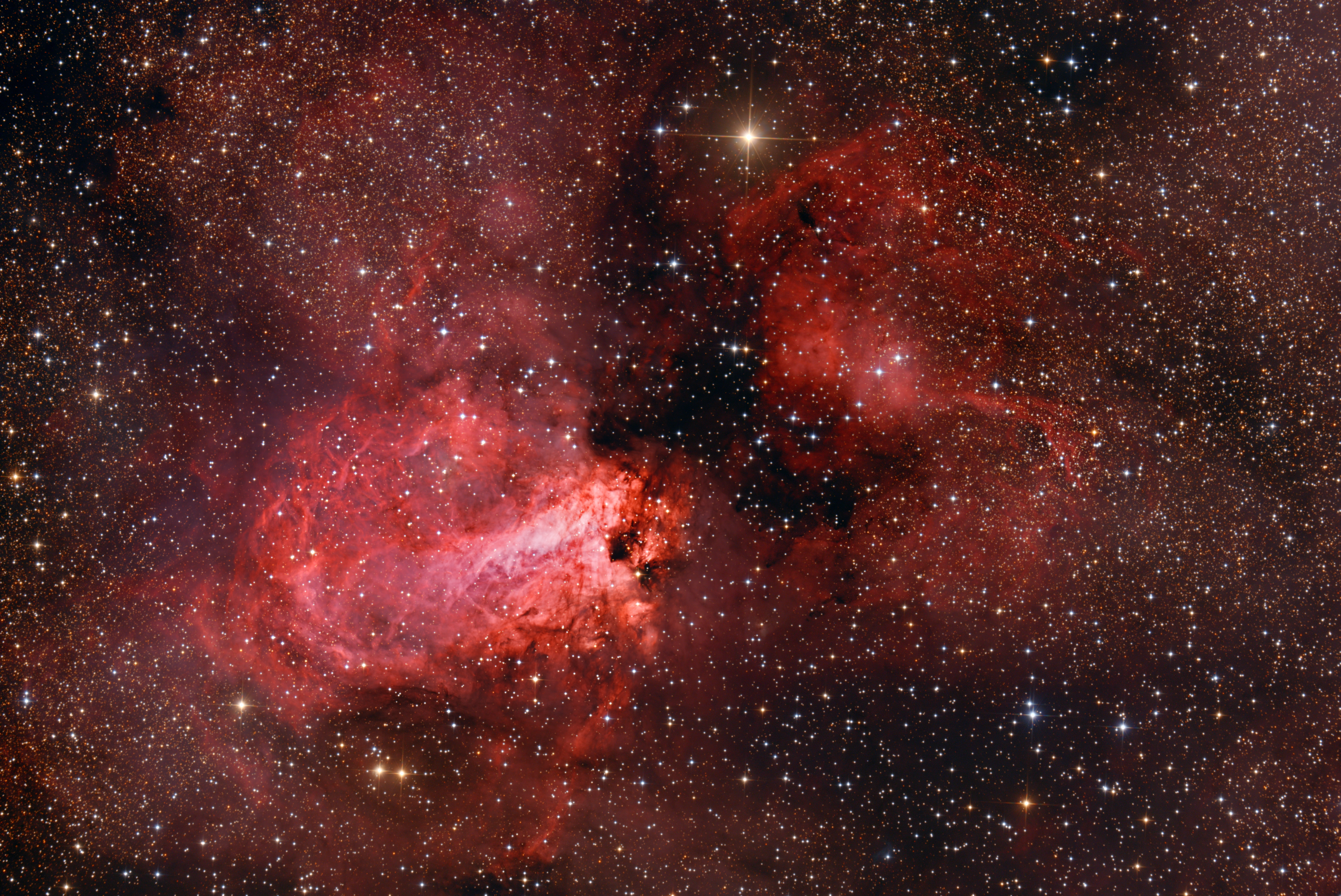 Messier 17 hat viele Trivialnamen: Schwanennebel, Omeganebel oder Hufeisennebel. Es handelt sich um einen klassischen Gasnebel unserer Milchstraße, dessen leuchtendes Rot durch ionisierten Wasserstoff zustandekommt. Dafür verantwortlich sind junge, heiße Sterne im Inneren des Nebels, sogenannte O-Sterne. Die Strahlung dieser Sterne formt auch die filamentartigen Strukturen im östlichen Teil des Nebels. Deutlich zu erkennen ist außerdem ein bläulicher Schimmer, der den ganzen Nebel umgibt. Hier wird das blaue Licht der O-Sterne an der interstellaren Materie gestreut.