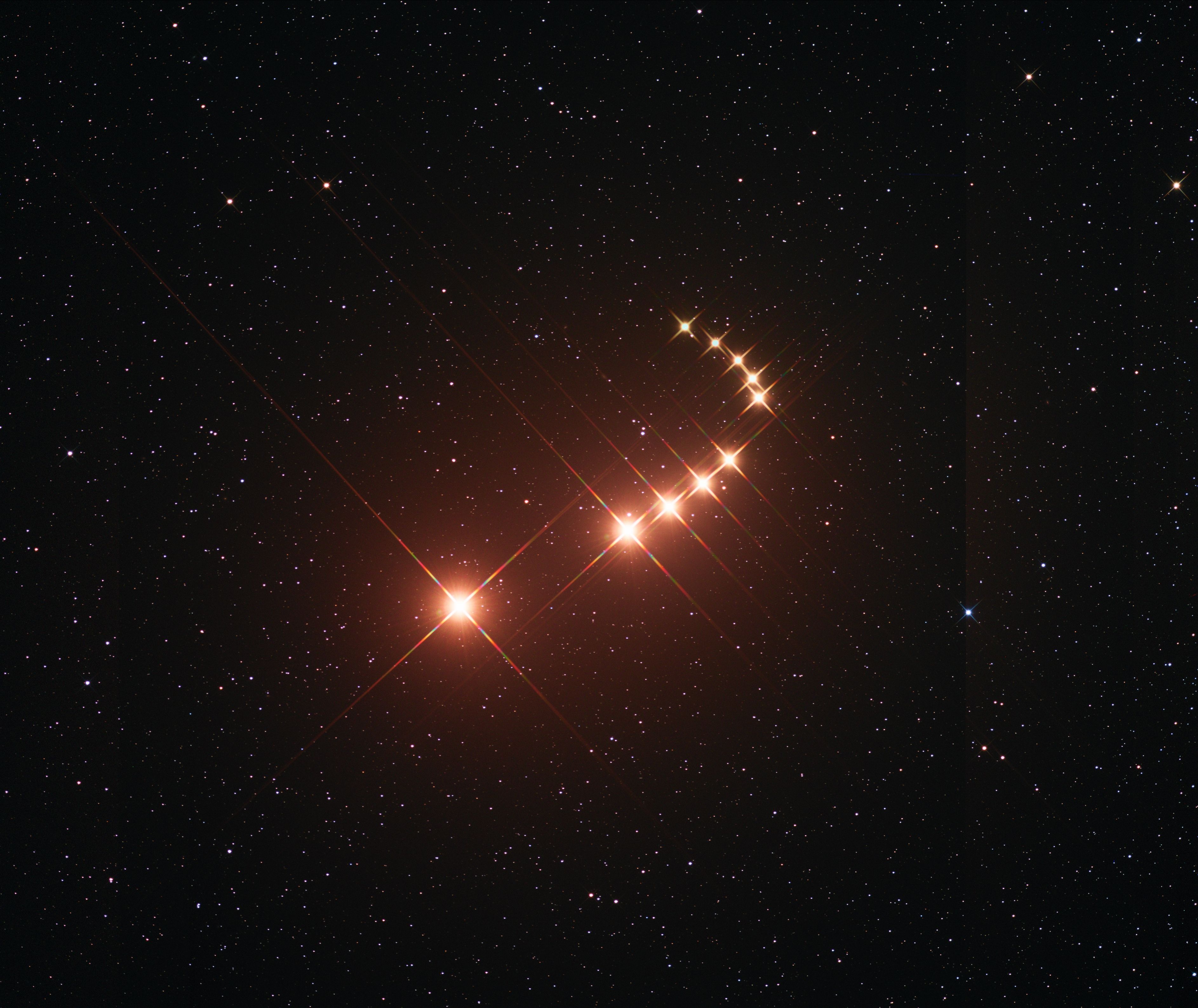 Die Erde überholt den Mars auf der Innenbahn. Die gestackten Aufnahmen zeigen den Mars an zehn Tagen am Wendepunkt. Dabei wird der Mars nach unten links wieder rechtläufig. Hellster Stern unten rechts ist 49 Gemini (Größenklasse 7).
