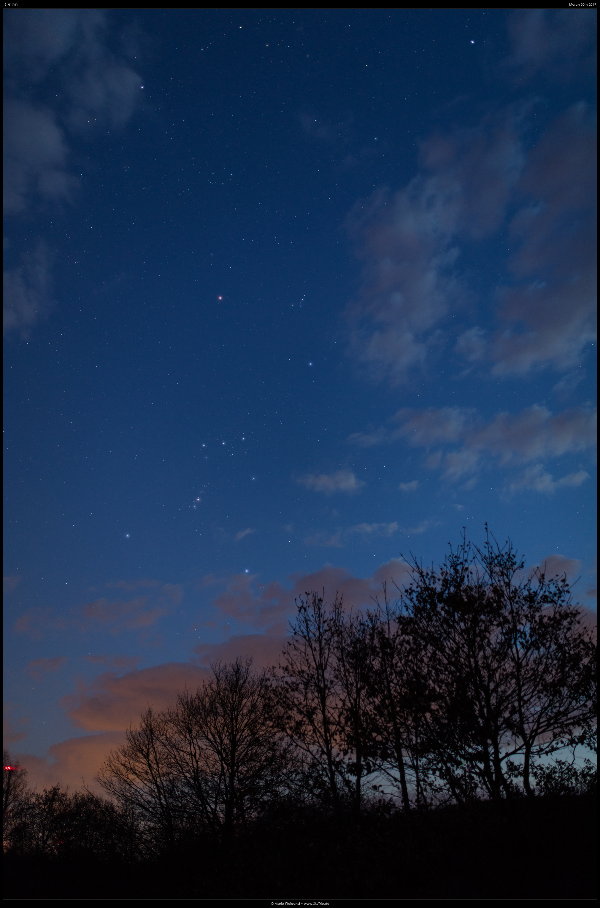 Ende März heißt es Abschied vom Winterhimmel zu nehmen, hier ein "Abschiedsfoto" des Sternbildes Orion in der Dämmerung über dem Hintertaunus. Die immer später einsetzende Dunkelheit und die gleichzeitig früher werdende Untergangszeit lassen den Himmelsjäger schnell vom Abendhimmel verschwinden. http://www.skytrip.de/ori-1a.htm
