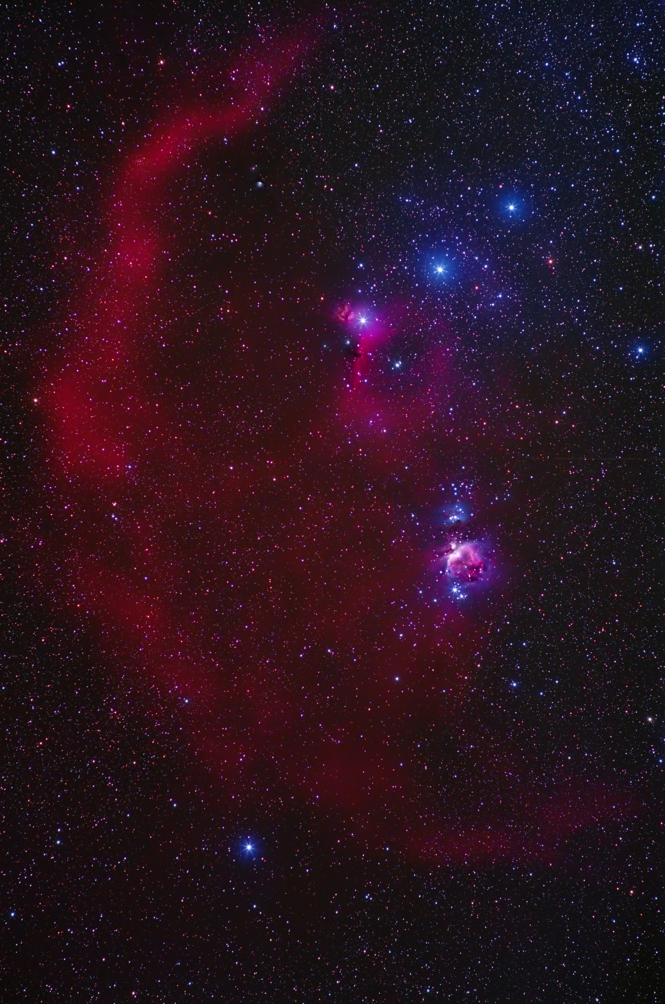 Trotz der kurzen Brennweite sind (neben den allseits bekannten Nebeln wie Pferdekopf, Running Man, Orion, Flammennebel, usw) viele Interessante Strukturen zu sehen vor allem die Materieverteilung von emitierenden Wasserstoffgas (rot), reflektierenden Partikeln (bläulich) und deren Mischungen die magentafarbene Bereiche bilden.