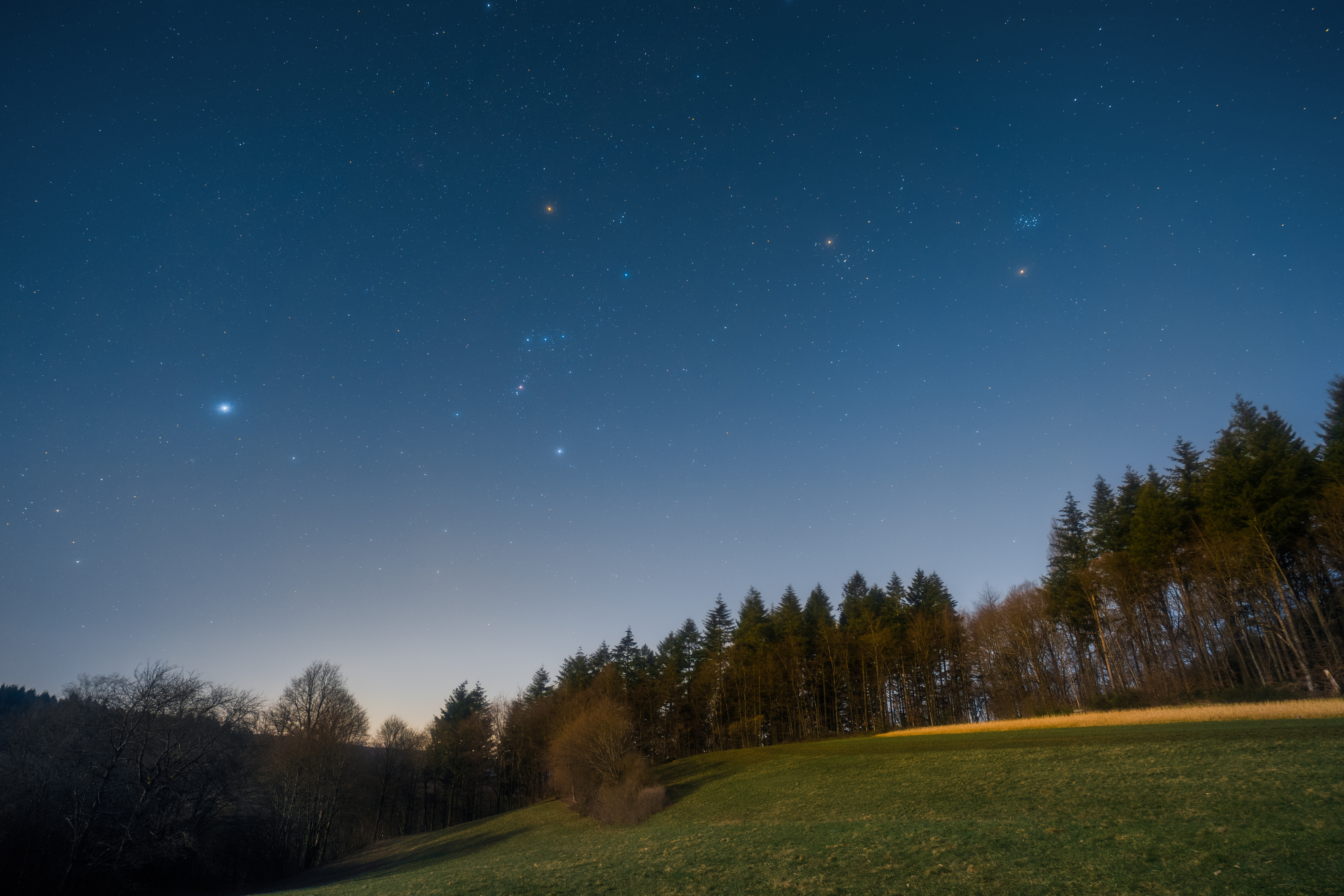 Bei (fast) Vollmondlicht konnte ich bei Lampenhain im Odenwald diese Landschaft fotografieren. Am Himmel zu sehen sind unter Anderem die Gürtelsterne des Orion sowie Beteigeuze, Sirius, Aldebaran, Mars und die Plejaden. Mit Hilfe eine Diffusors vor dem Objektiv konnte ich die hellen Sterne im Bild hervorheben. Der Orionnebel ist ebenfalls erkennbar.