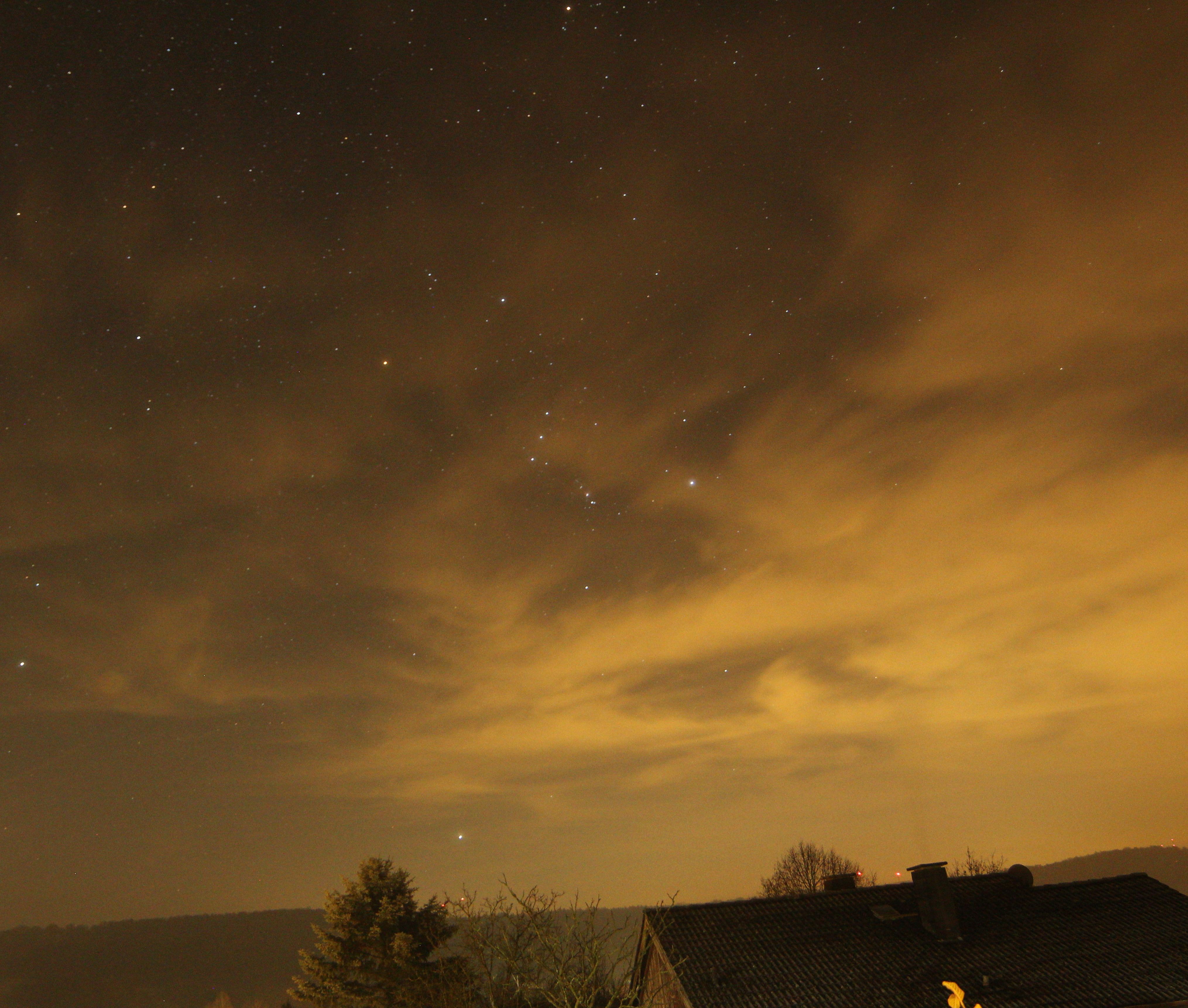 Der Orion stand S/SO direkt gegenüber unserer Terrasse. Mit bloßem Augen hat man die Bewölkung überhaupt nicht gesehen. Ich finde sie aber gelungen als Kontrast zu dem Rest. Im Hintergrund ist die Airportbeleuchtung von Frankfurt zu erahnen.