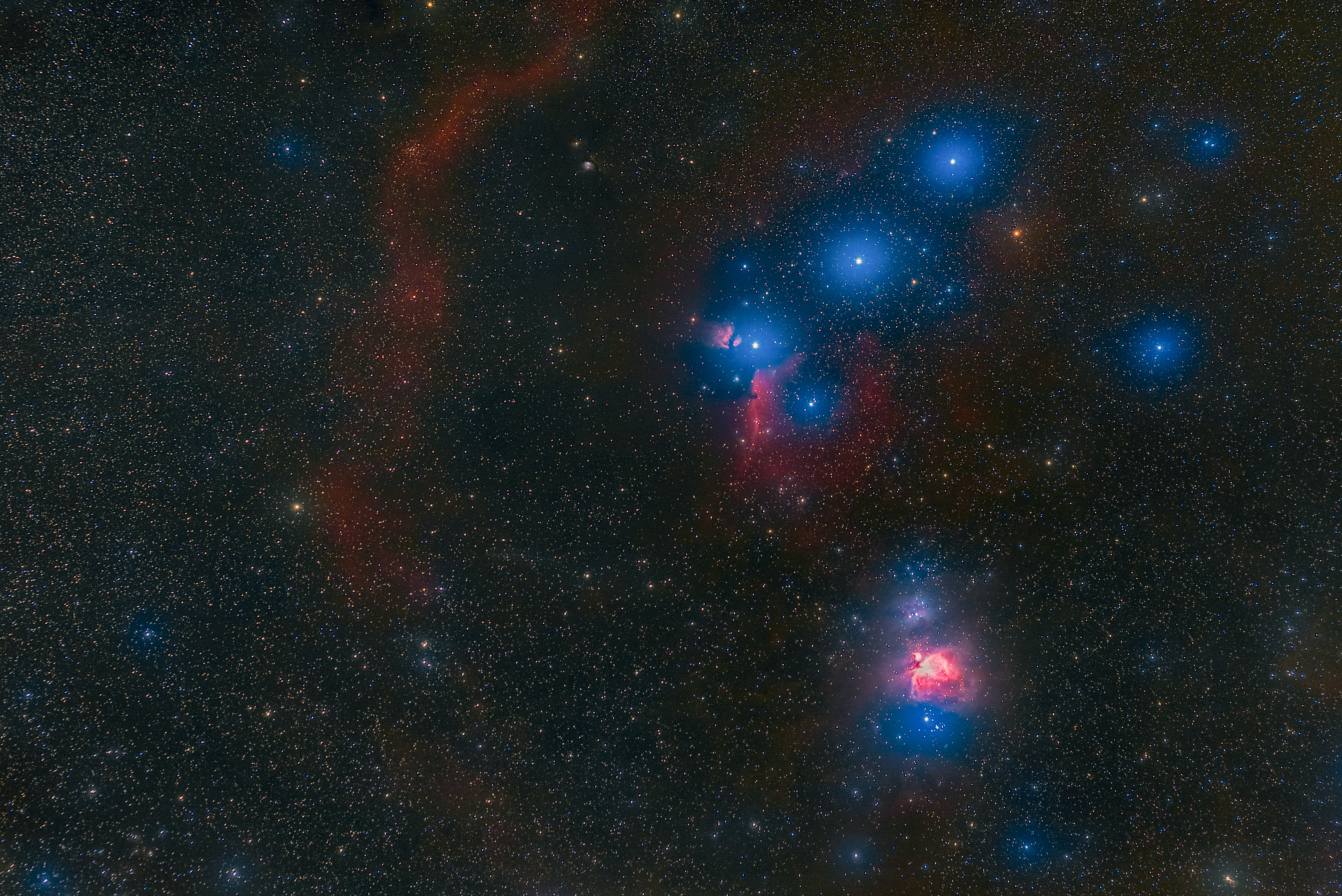 Während meines Ausflugs nach Wachenheim am 27. Februar 2022 hatte ich an meiner Montierung zwei Kameras gleichzeitig im Einsatz. So konnte ich neben einer Weitwinkelaufnahme (siehe https://www.spektrum.de/alias/wunder-des-weltalls/orion-ueber-wachenheim/1993939 ) auch dieses Bild mit 135 mm Brennweite aufnehmen. Zu sehen sind neben den markant hellen Sternen der Orionnebel, Pferdekopfnebel, Flammennebel, Running-Man-Nebel sowie ein Teil der Barnardschen Schleife links im Bild. Dazu habe ich eine für Astronomie modifizierte Kamera benutzt. Am Objektiv meiner Kamera hatte ich zwei Filter gleichzeitig montiert: Einen Filter zur Unterdrückung der Lichtverschmutzung und einen Diffusor zur Hervorhebung der hellen Sterne und deren Farben.