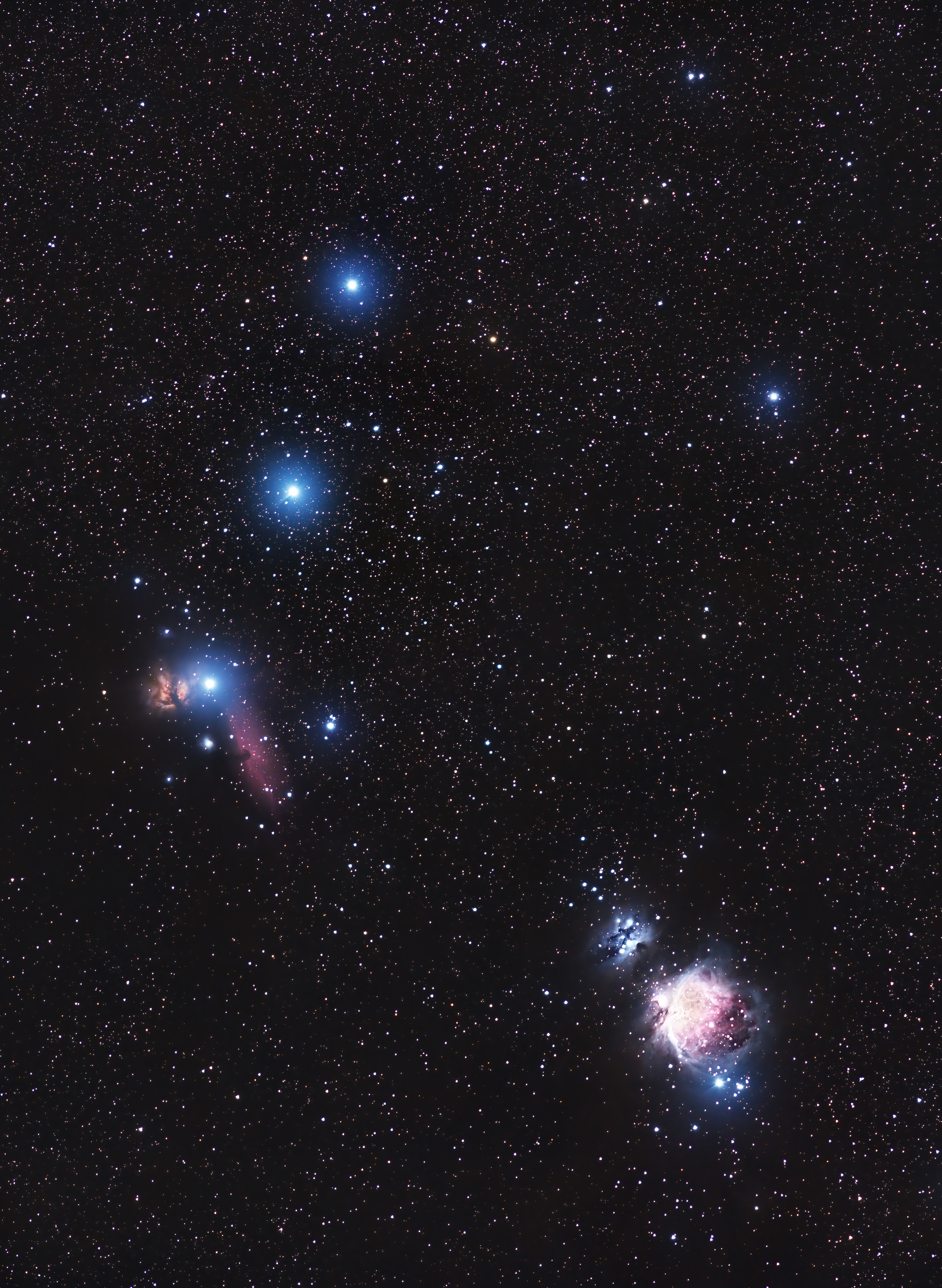 Orion-Gürtel, IC 405 Flaming-Star-Nebel, IC 434 Pferdekopfnebel, M42 Orionnebel. Ich wünsche allen ein gutes und gesundes neue Jahr und eröffne es mit einem der schönsten Objekte, das jetzt am Himmel steht.