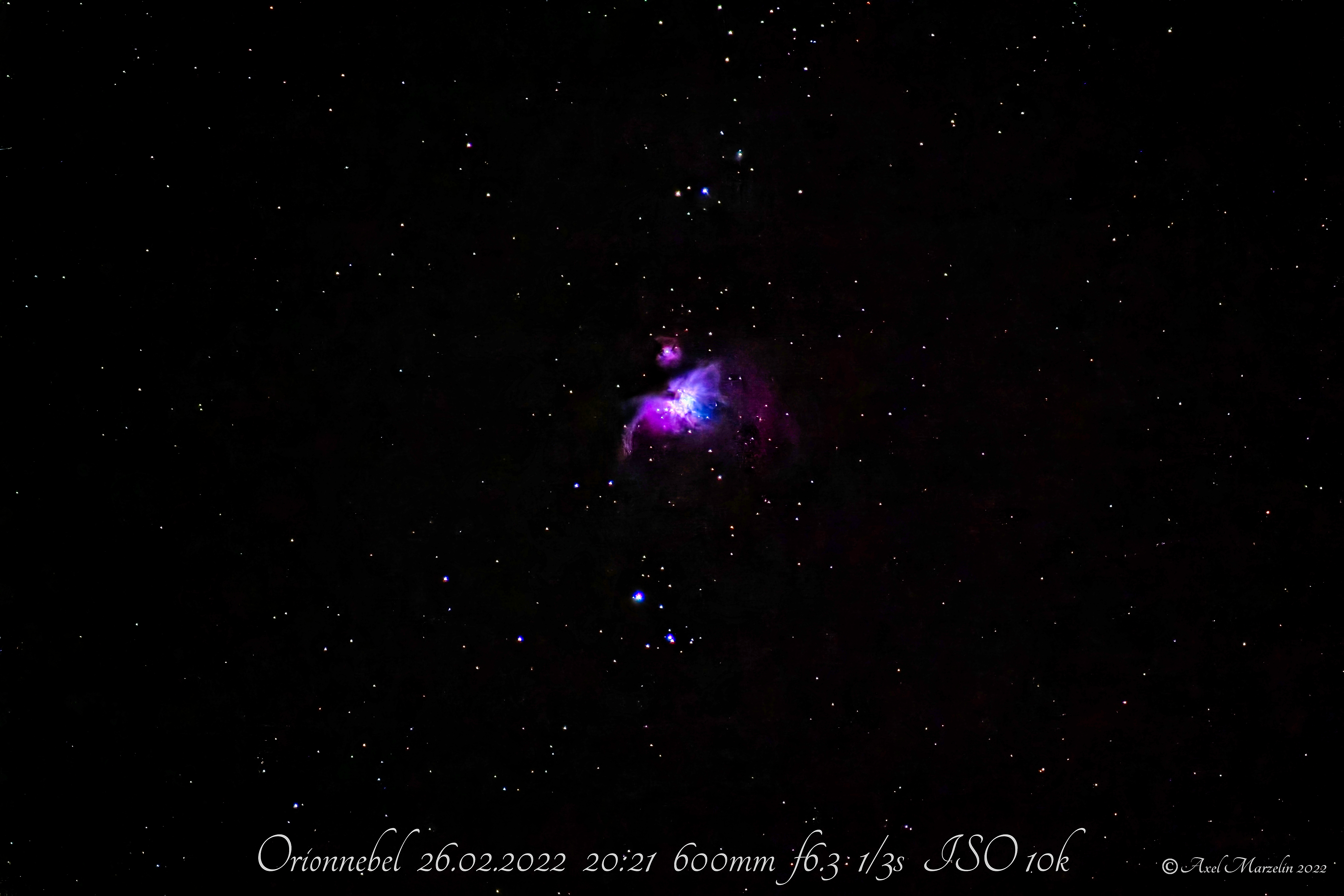 Eigentlich möchte ich mit diesem Foto zeigen, dass man auch ohne spezielle Astroausrüstung das eine oder andere Himmelsobjekt relativ gut ablichten kann. Bei diesem Foto vom Orionnebel kam nur die Sony A7 M3, das Sigma-Objektiv 150-600 mm und ein stabiles Stativ zum Einsatz. Bearbeitet wurde das Foto, etwas heftig, mit DXO.