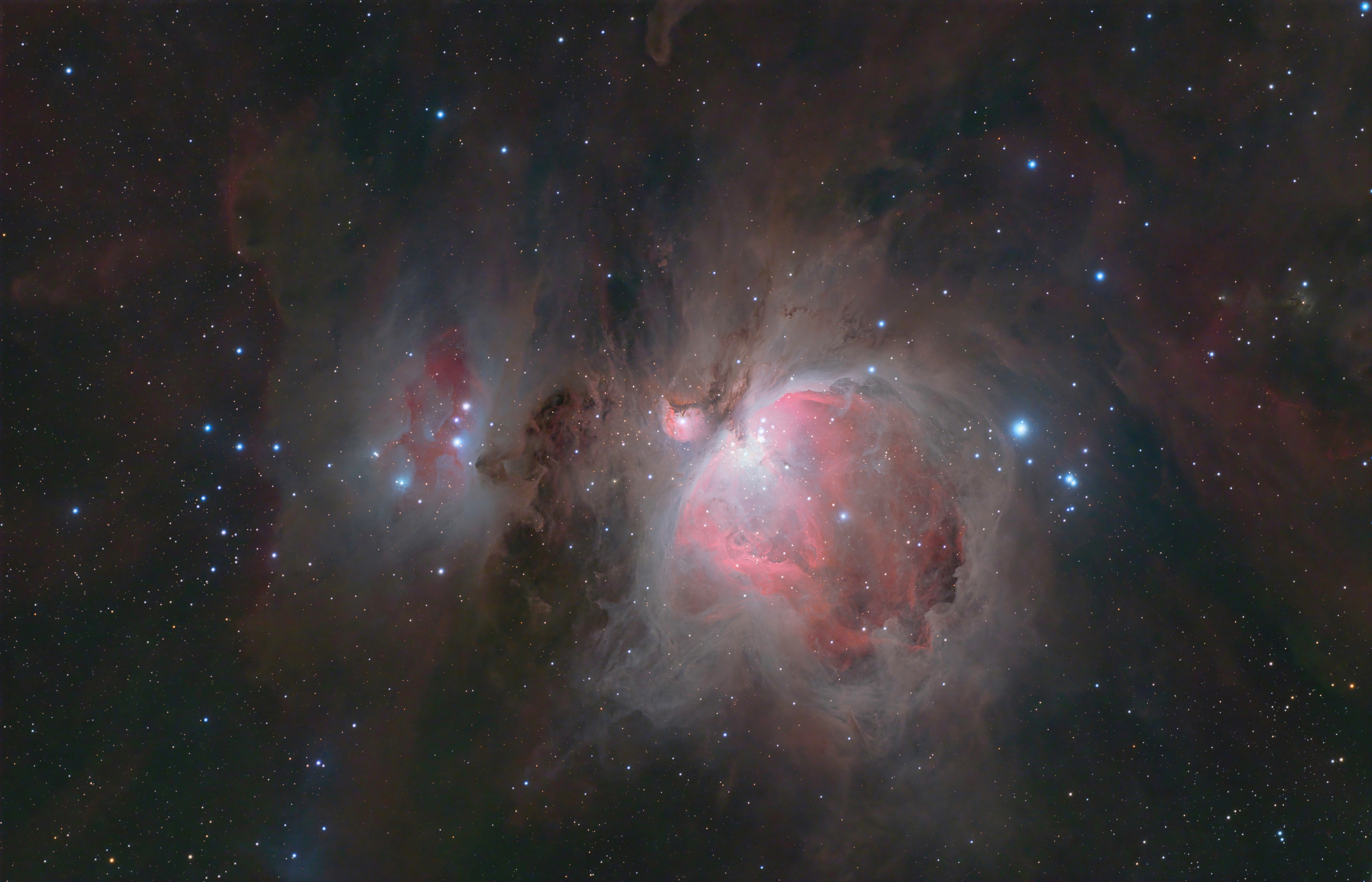 Messier 42, der große Orionnebel im gleichnamigen Sternbild Orion. Definitiv ein Juwel am winterlichen Nachthimmel und doch nur ein kleiner Teil eines riesigen Molekülwolkenkomplexes. Gelegen ist dieses Sternentstehungsgebiet wie unser Sonnensystem auch, im Orion Arm der Milchstraße. Aufgenommen am 2. Weihnachtsfeiertag 2024 ohne Filter und zusätzlich mit H-alpha/O3 Filter um den Wasserstoff noch etwas zu betonen. Auch zu sehen NGC 1977, der Running-Man-Nebel, der deutlich lichtschwächer als der Orionnebel ist.