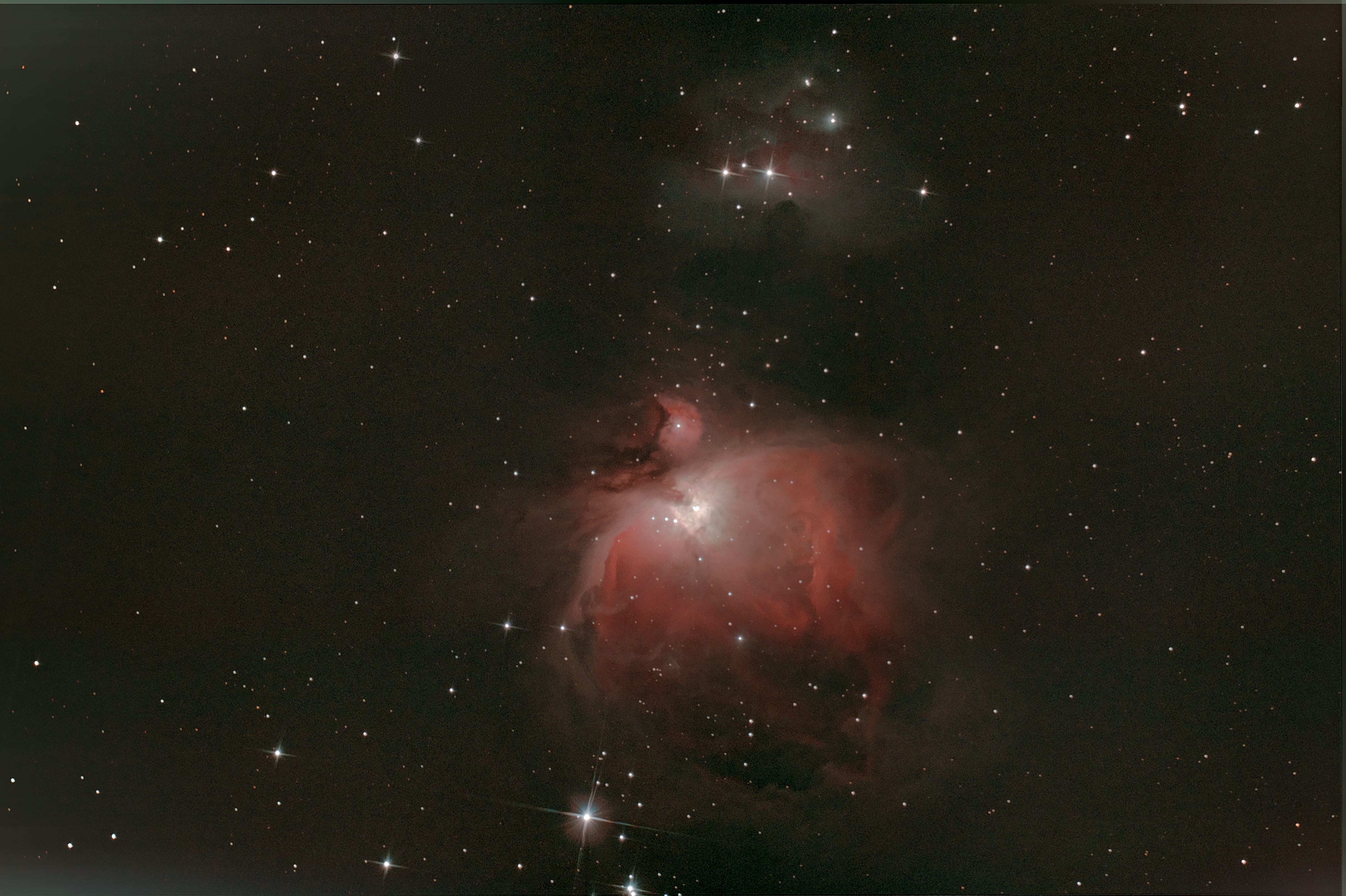Vor kurzem hatte ich für die mobile Astrofotografie unter Verwendung der EQ 5 einen kleinen Skywatcher-Newton 130/650 mm (man will sich ja nicht totschleppen) angeschafft. Zusammen mit dem Lacerta MGEN-Autoguider eine hervorragende Plattform für die mobile Arbeit auf dem Feld u.ä. Am Abend des 11.3.2014 konnte ich dann testweise eine erste Belichtungsreihe des Orionnebelkomplexes vom heimischen Balkon aus unter erheblicher Lichtbelastung einige Tage vor Vollmond anfertigen: ich bin zufrieden !