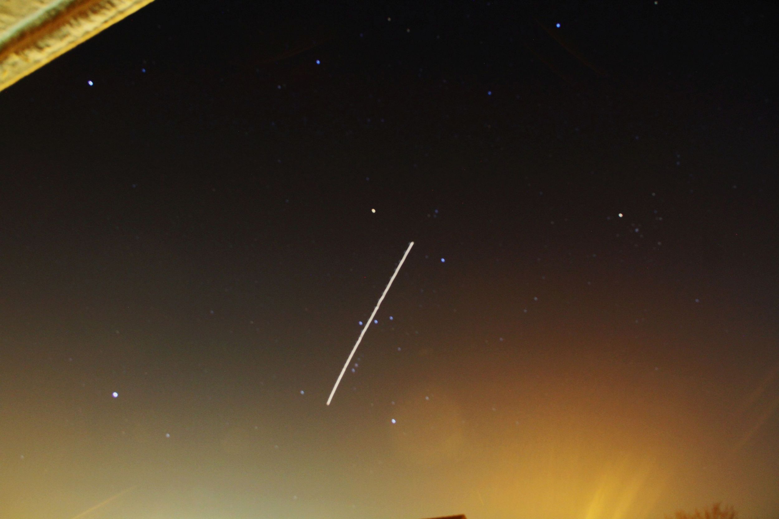 Baumberg am Rhein, März 2014, abends um 22 Uhr, klare Sicht, ich konnte viele Bilder vom Südsüdwest-Sternenhimmel machen. Da kreuzte dann ein Flugzeug quer durch das Sternbild Orion.