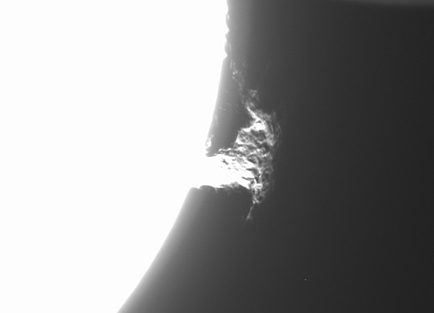 Um 14:36 Uhr entstand dieses Bild. Um die gesamte Ausdehnung und die komplexen Strukturen dieser Protuberanz sichtbar zu machen, wurde die Belichtungszeit auf 1/90 sec erhöht. Man vergleiche mit Bild 1!