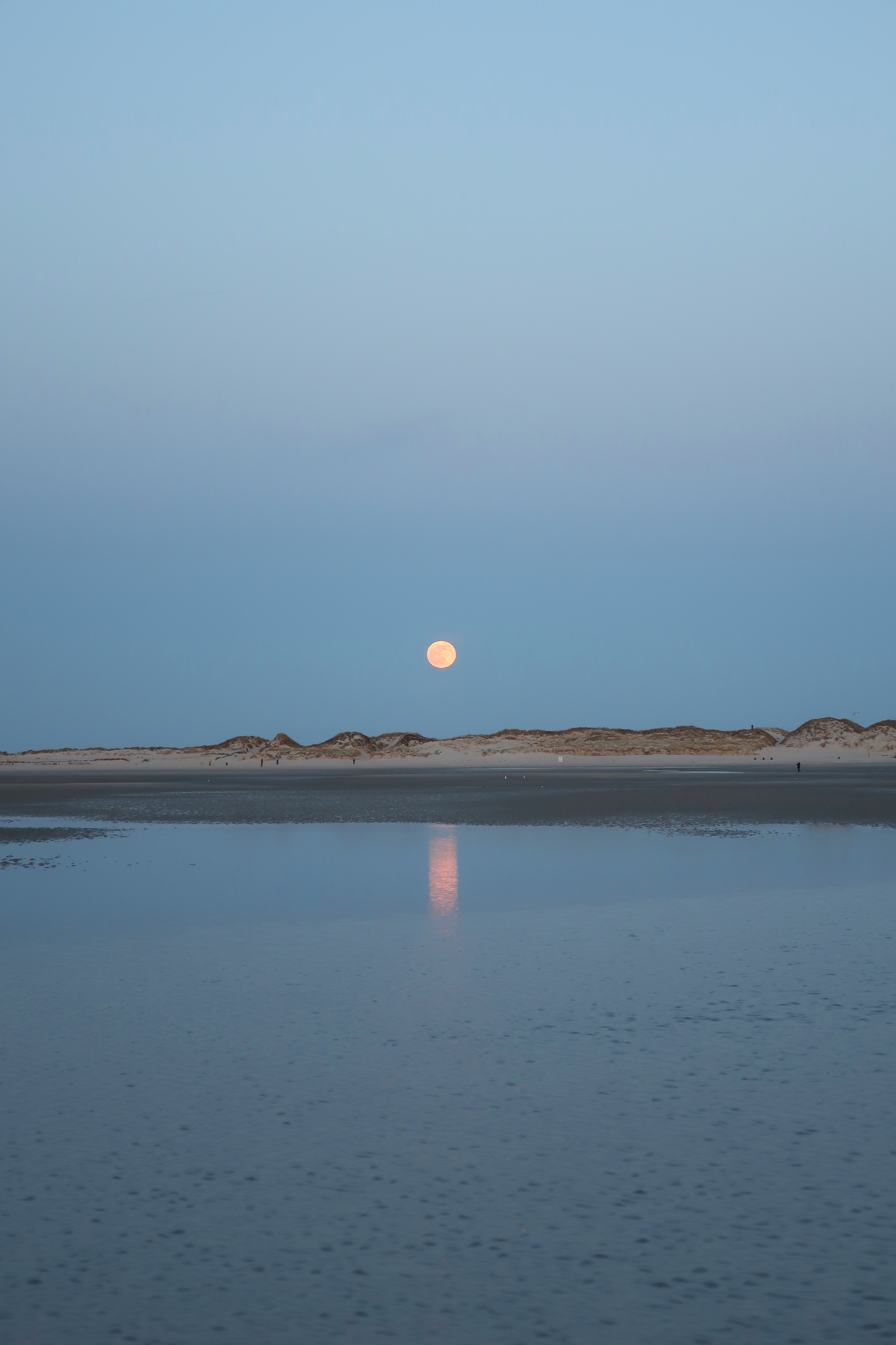 Aufgang des Vollmonds am Samstag vor Ostern über den Dünen von Amrum. Der Standort lag auf der Seeseite auf einer Sandbank bei auslaufendem Wasser bei Norddorf.